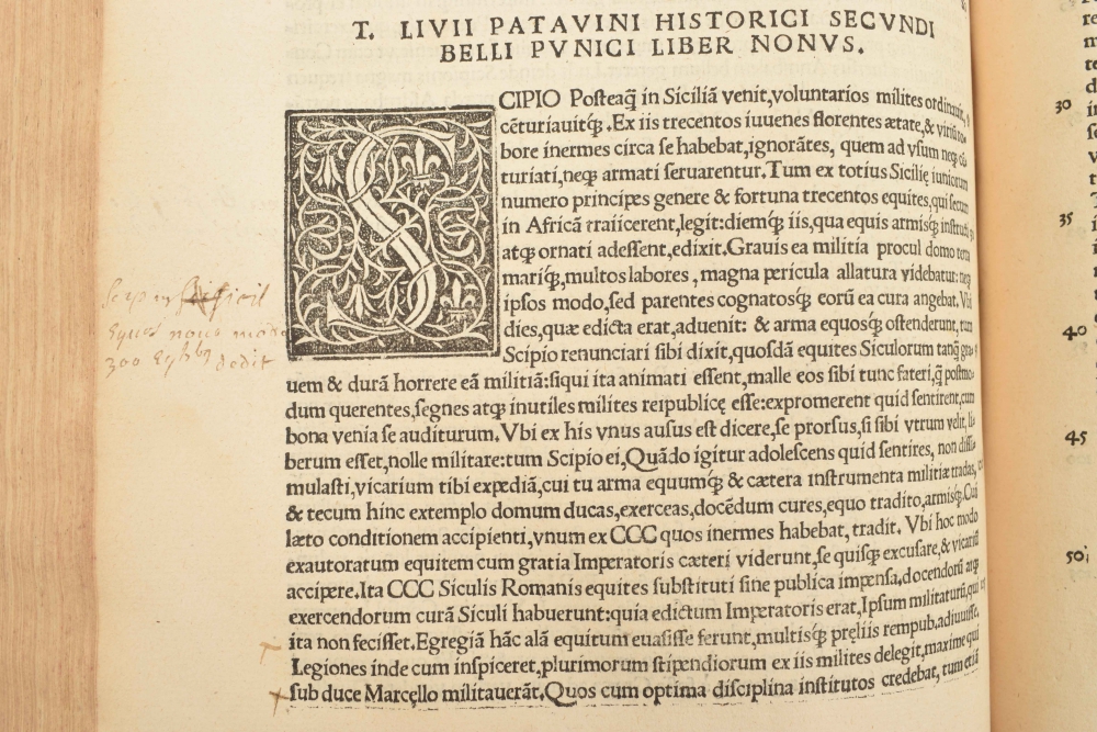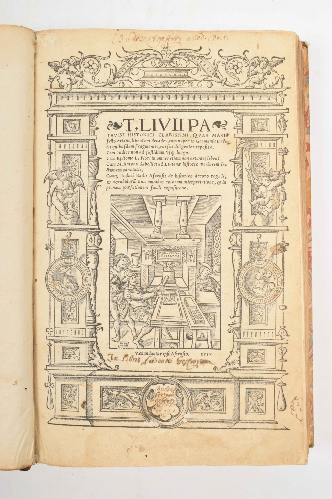 T. Livii Patavini Historici Clarissimi, Quae Manifesto extant librorum decades, cum nuper in Germania inventis quibusdam fragmentis (...). Cum epitome L. Flori (...). Cum M. Antonii Sabellici as Liviane (...) Cumq. Jodoci Badii (...) [et] in prinam praefationem facili expositione. [Jodocus Badius. Paris]. 1530; bound together with: Titi Livii Patavini Historiarum ab urbe condita decadis Quintae. [Badius. Paris] 1531.