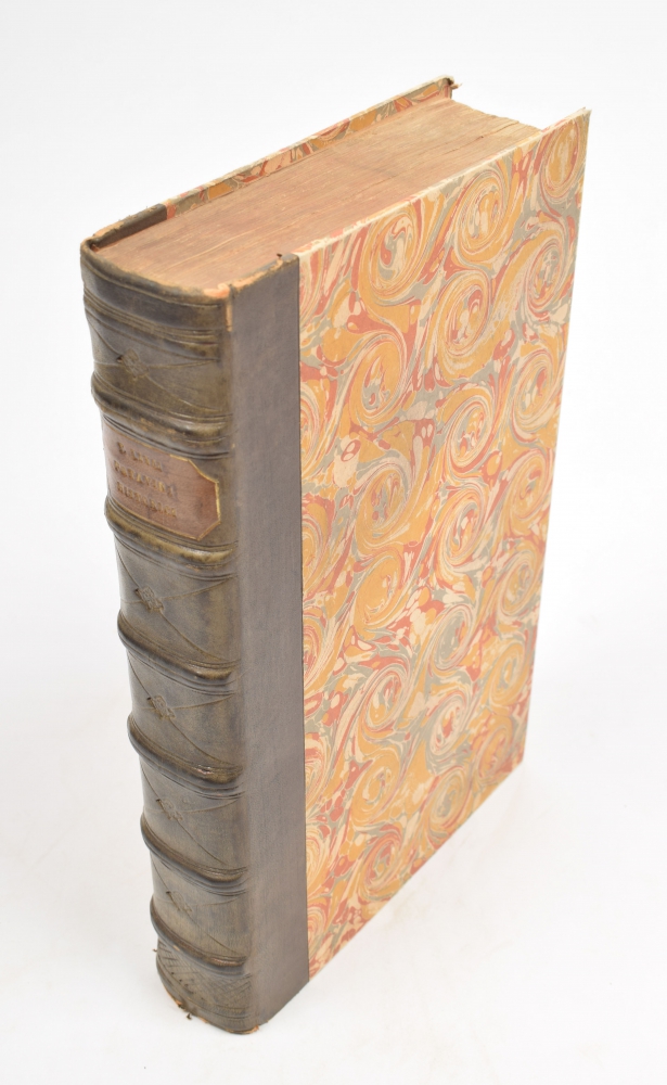Folio, new binding, half leather with marbled boards. Illustrated title page with title, embroidery and centered large printer's mark of Badius. (42),313ff=626; XLff=80 pp. + Chronologia by Henricus Glareanus + Tabella Literarum; lacks the final two pages of the "Tabella Literarum". Various detailed capitals. New endpapers; annotations in ms. on endpapers and with text leaves. Various stains and water stains at beginning and end, else good.