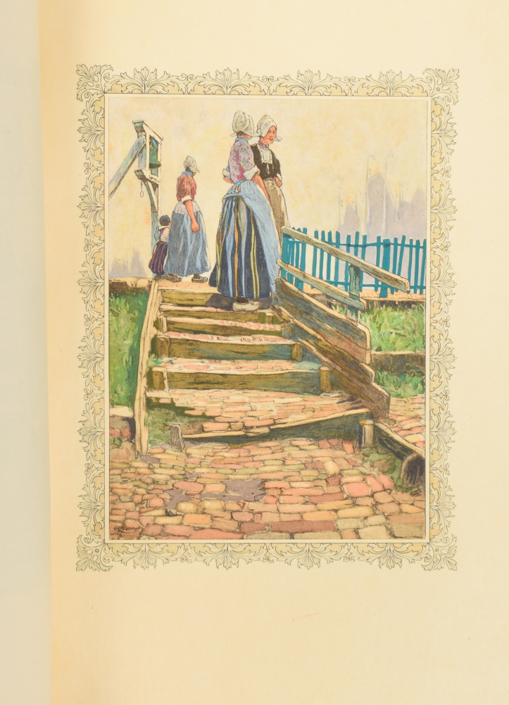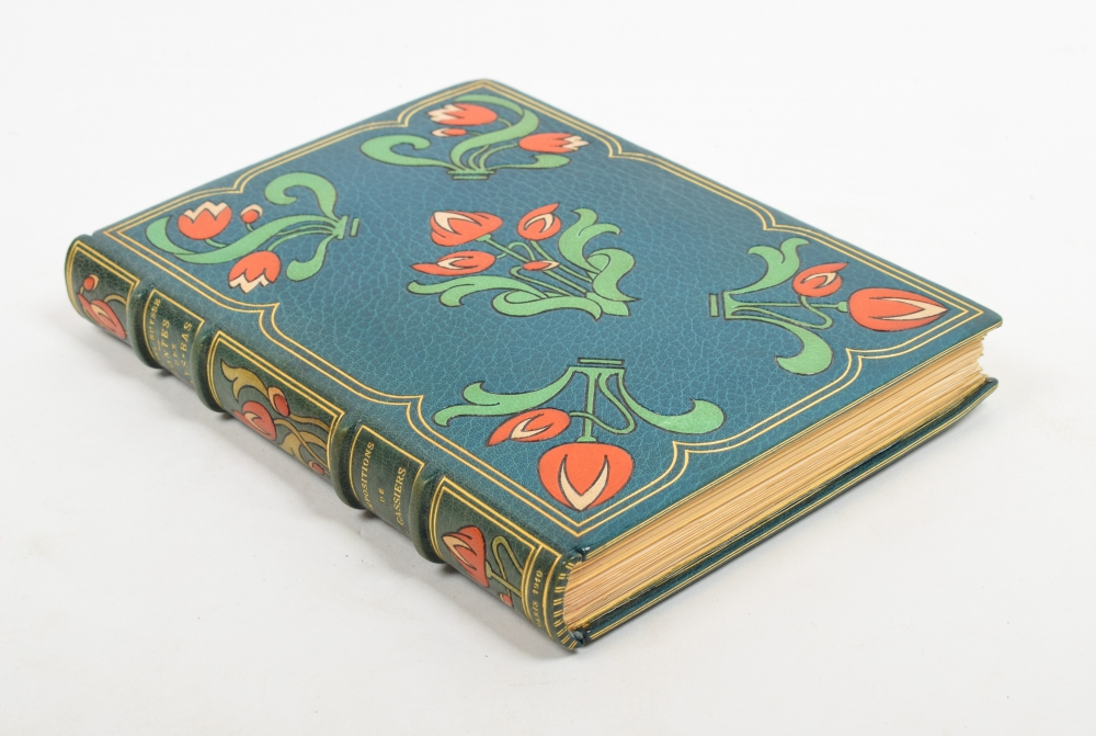 Illustrations de Henri Cassiers. Paris, printed by G. Kadar for L'Édition d'Art, H. Piazza, 1910, printed in 300 numbered copies (this is number 28, one of 40 copies on Japanese paper with an extra suite of the illustrations in b/w), 159,(6) p., very richly illustrated with coloured title illustration and 50 coloured illustrations in the text (10x full-page, else mostly half-page) and rich other book decoration by Henri Cassiers, exuberant contemporaneous Art-Nouveau style binding by Charles de Samblanx in full phtalo blue/ green morocco with various other coloured leather inlaid (tulips) and with gilt border, on the inside of both boards a signed watercolour (21 x 14 cm.) by Albert Geudens (1869-1949), silk endpapers, bound with original wrapper, all edges gilt, in original cardboard slipcase with morocco letterpiece, the slipcase in yet another slipcase, 4to.