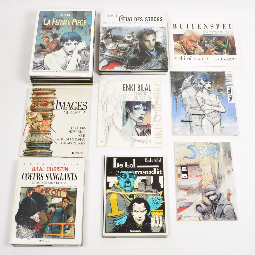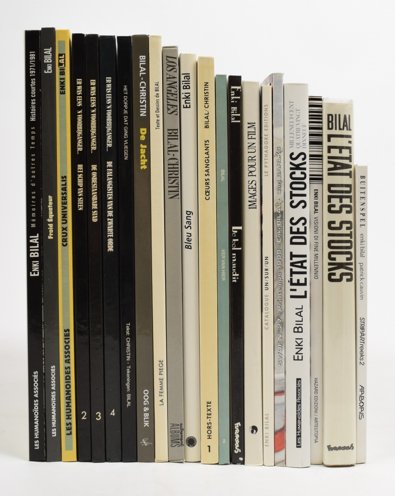 Er was eens 'n Voorbijganger... 1-4, Enki Bilal, Dargaud/Oberon 1978-'79 + De Jacht. Oog & Blik, 1998 + La Femme Piege, Dargaud, 1986 + Bleu Sang, Desbois, 1994. Hc with dust jacket + Histoires courtes 1971/1981. Les Humanoïdes Associés, 1996 + Le Bos Maudit. Futuropolis, 1982 + L'état des stocks. Futuropolis 1986, with supplement - and another 8 by Bilal.