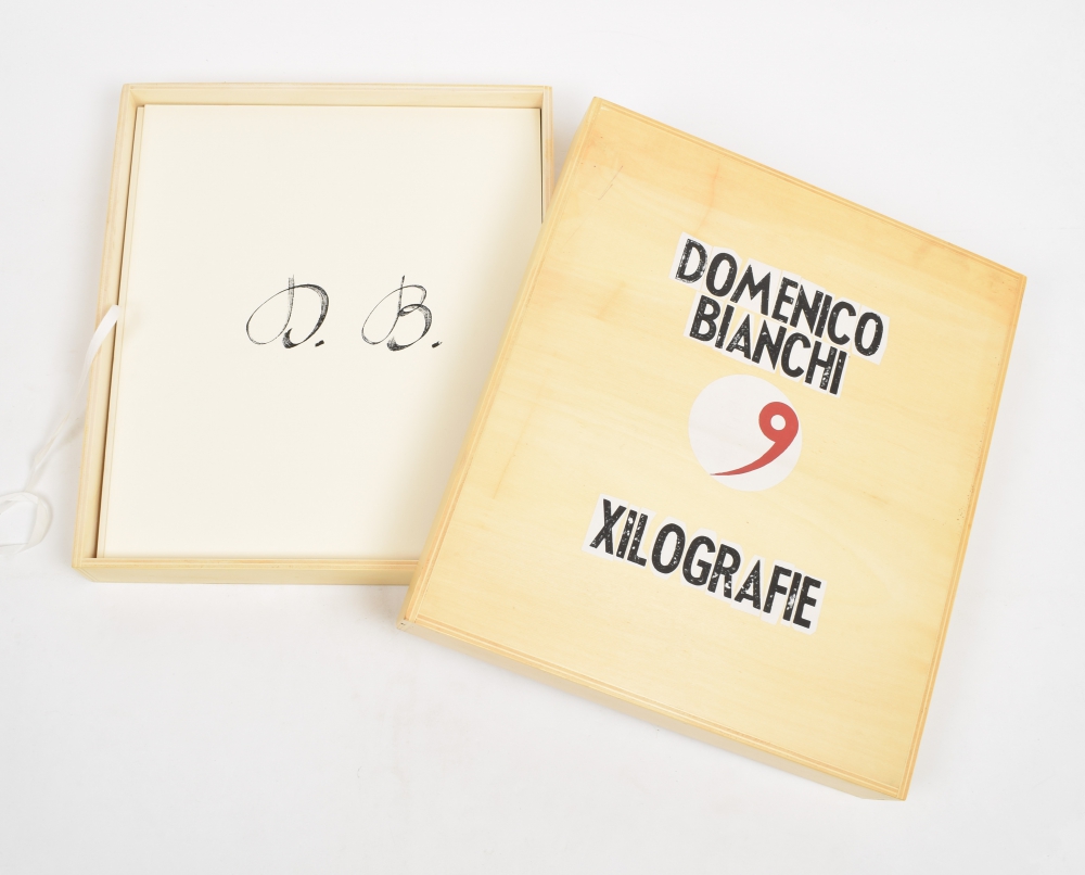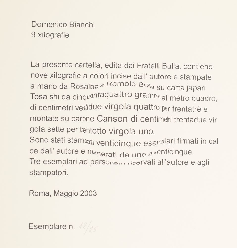 Roma, Maggio 2003. Wooden box with 6 xilographies, dedication page and page with initials. Box 38 x 33 cm. Xilographies each 22.5 x 17 cm.