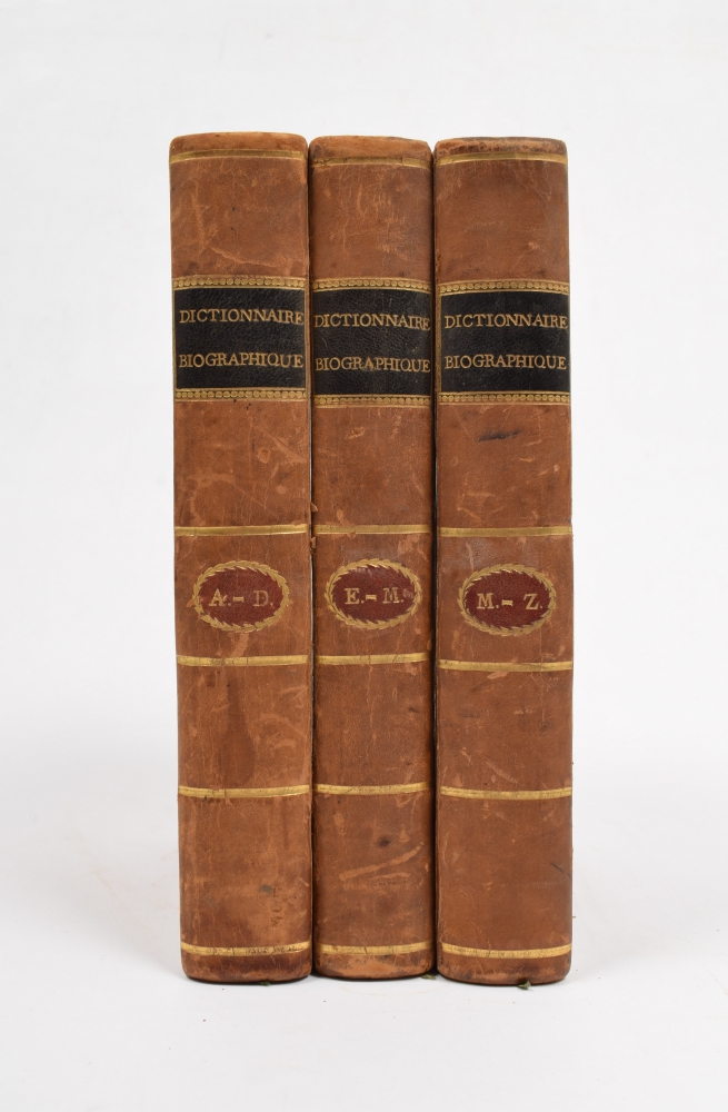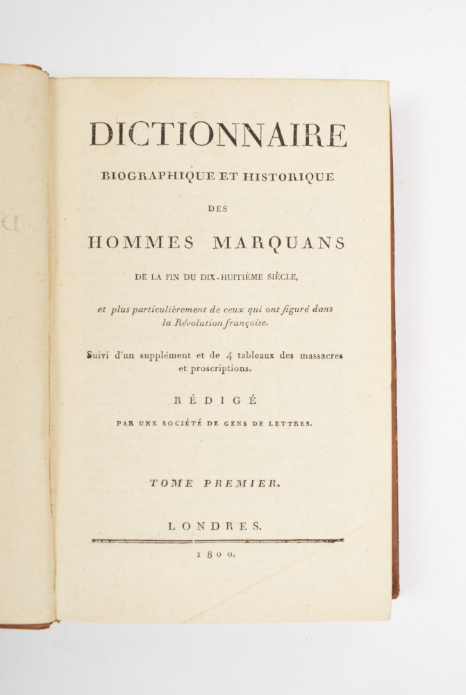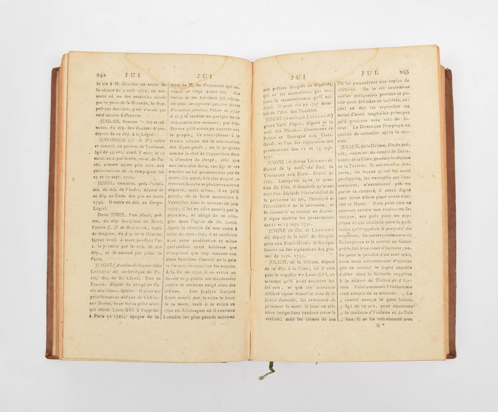 8vo, leather, 3 volumes, uniformly bound, titles on spine in black and gilt stamping, XII,499; 524 and 522,XXIV pp., complete with 2 folding leaves with 4 lists of names incl. conspirators and/ or victims of the French Revolution. Interesting and good set (total 3).