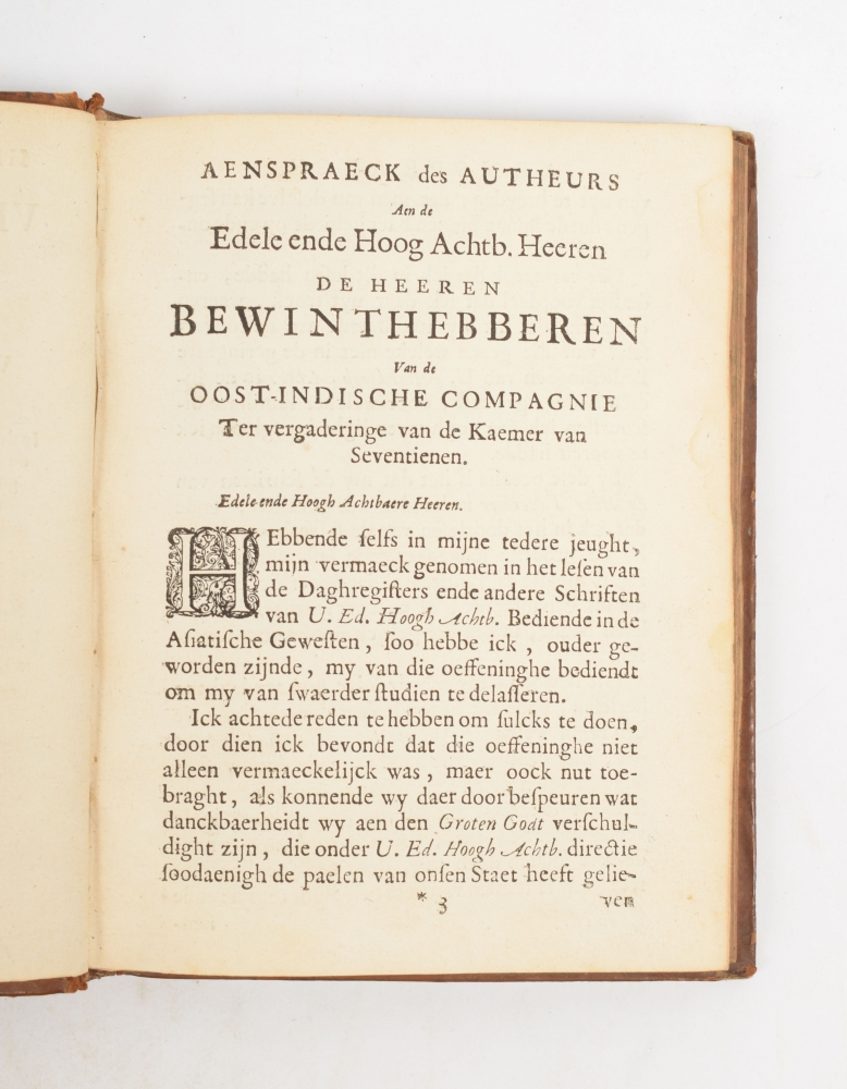 Henrick van Quellenburghs Vindiciae Batavicae ofte Refutatie van het Tractaet van J.B. Tavernier, Chevalier, Baron d'Aubonne &c. In de welcke niet alleen de valsheydt van veele lasteren ende leugenen, den Staet, de Ed. Hoogh Achtb. Compagnie ende natie aengewesen (...). Amsterdam. Jan Bouman. 1684. Small 4to, leather, title on spine in red and gilt stamping, allegorical frontispiece, title with printer's mark, (4),318,(2) pp., without the sometimes inserted map of Batavia. Bookblock with browning, else a good copy.