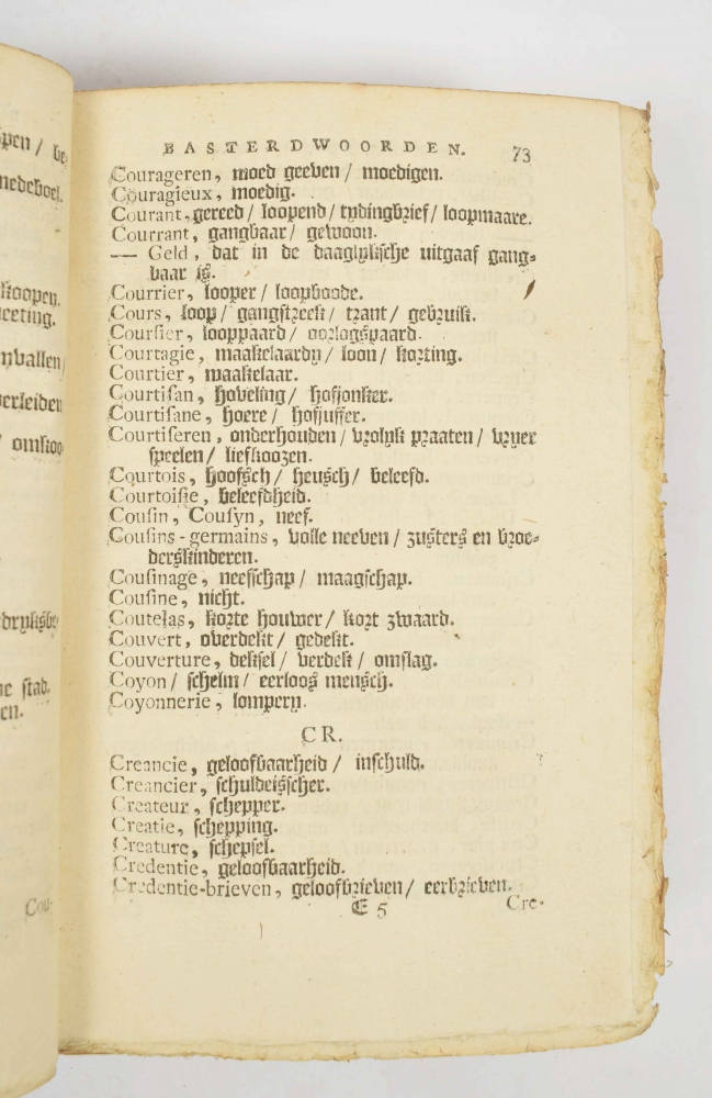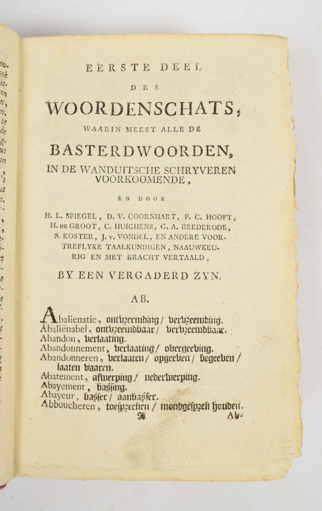 Vervattende, in drie deelen, 1. Basterdwoorden. 2. Kunstwoorden. 3. Verouderde woorden. Ernst Willem Cramerus. [3 parts in one volume]. Amsterdam, Wed. Loveringh & Allart, 1777.