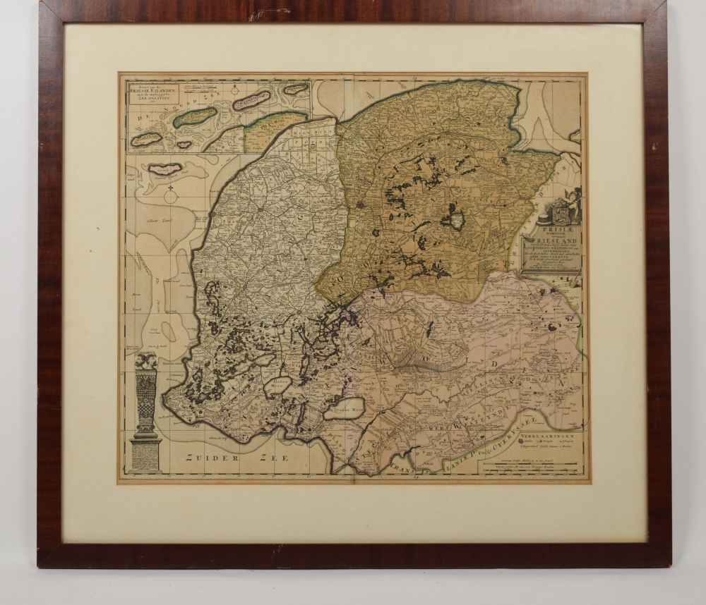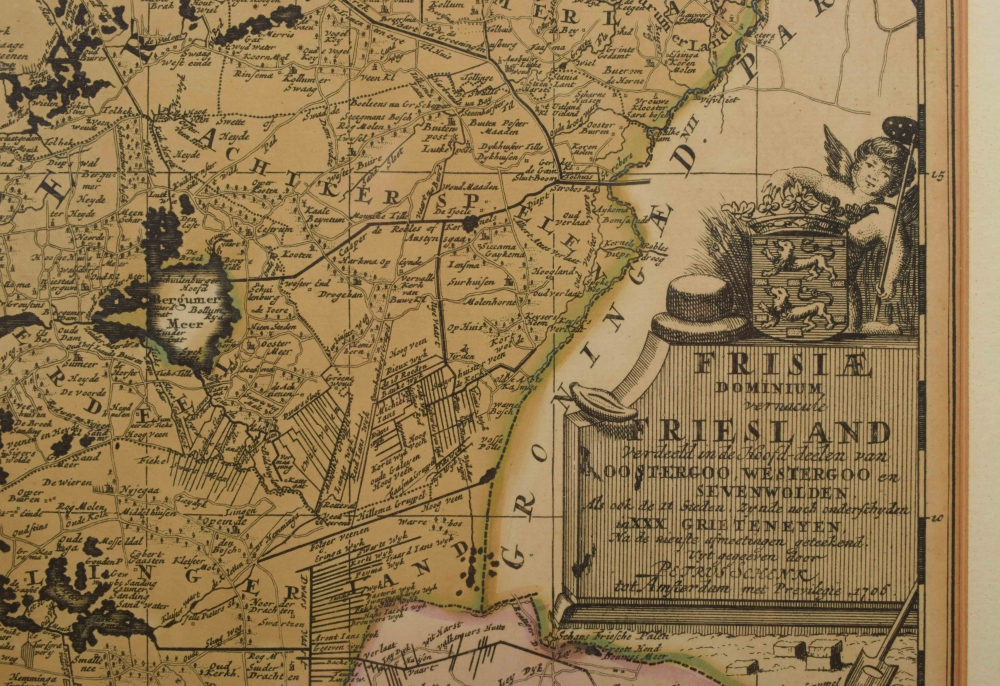 Verdeeld in de hoofd-deelen van Oostergoo, Westergoo en Sevenwolden, als ook de 11 steden, zynde noch onderschyden in XXX Grieteneyen, na de nieuste afmeetingen geteekend". Handcoloured, engraved map, published by P. Schenk at Amsterdam, 1706, 51 x 59.5 cm., in mount and in frame.