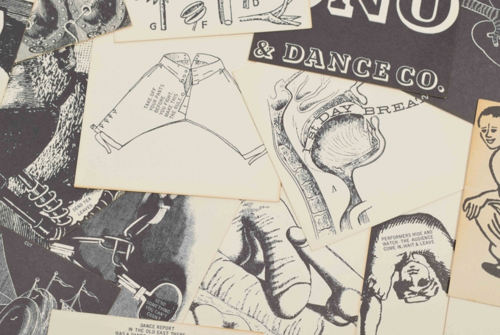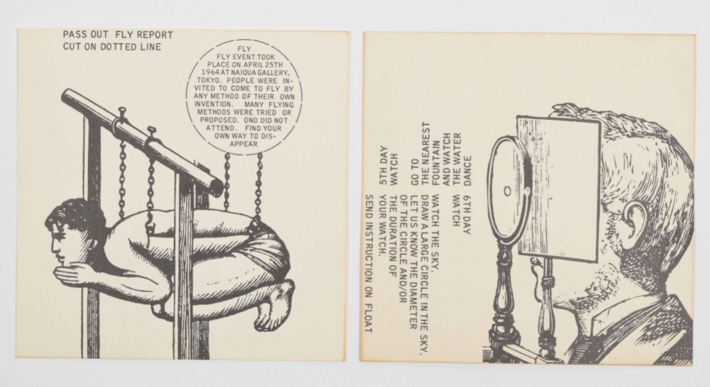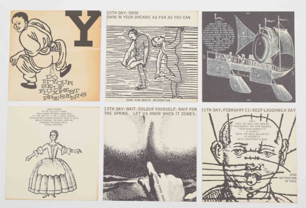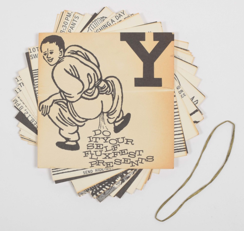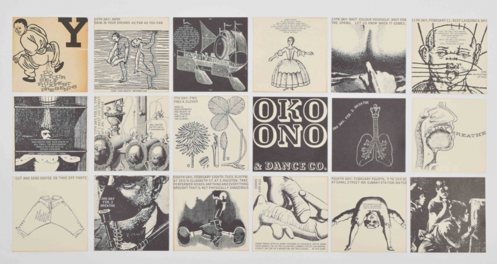 Fluxfest Presents Yoko Ono & Dance Co., 1966. Twenty offset cards, 10 x 10 cm. With instructional texts by Yoko Ono and humorous graphic illustrations by George Maciunas.