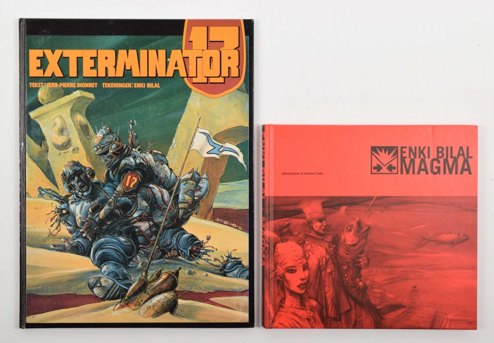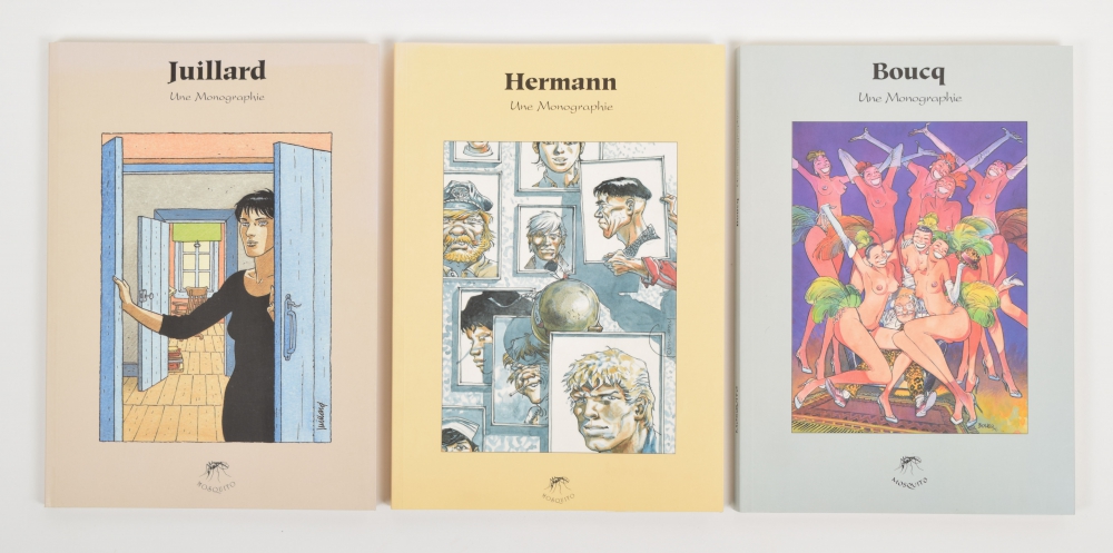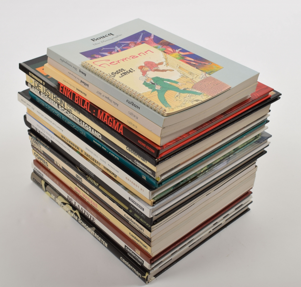 De Dorpsgek, Comès, hc, Casterman,1991. Numbered and signed and another 10 by Comès + L'Étoffe d'un Crack!, Hermann, sc, Bedescope, 1984 + Une Monografie, Hermann, sc, 1997 + 2 from the same series by Boucq & Juillard + Magma, Enki Bilal, hc, Hazard, 2000 and another by Bilal + Les correspondances de Pierre Christin, hc, Dargaud, 2009 - and 7 more.