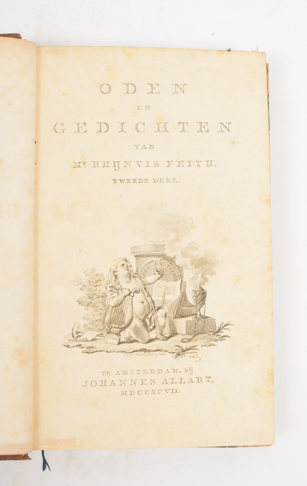 Oden en Gedichten. Mr. Rhijnvis Feith. [2 volumes]. Amsterdam. Johannes Allart. 1796-97. 8vo, 2 volumes, uniformly bound, half leather, title on spine in gilt stamping, 2x title with vignette by R. Vinkeles, portrait of the author.