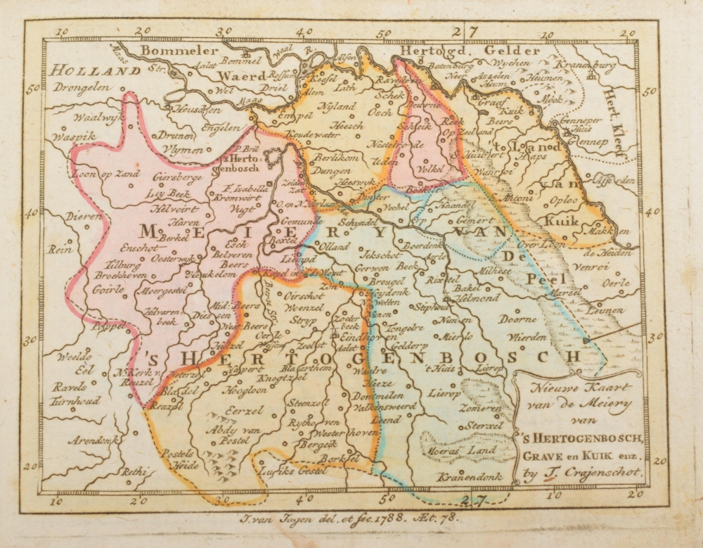 Without title page. Used, soiled copy repaired/ reinforced in several places (incl. the binding). Extremely rare, no copies of the atlas in PiCarta. With 2 separate maps listed there, however, comes a reference to our atlas. Cf. Koeman Crj. 1. See also Saakes, Naamlijst, for 1793 with the title that we used: "(...) bestaande uit 19 dito [afgezette] landkaartjes mede door J. van Jagen gegrav. in zeer klein formaat bij elkander ingen. (...) ". There, Saakes mentions first an edition by Crajenschot from the same year with 45 maps (also not in PiCarta).