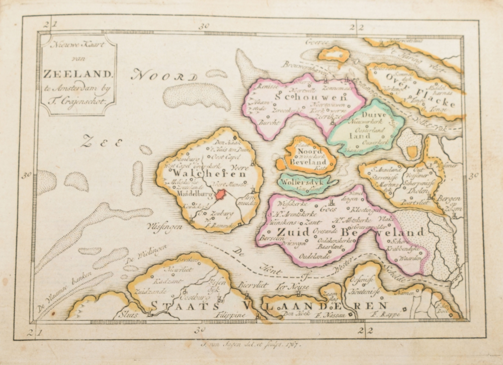 bestaande in 19 landkaartjes). (Amsterdam, T. Crajenschot, (1793)), with handcoloured, engraved overview map and another 17 handcoloured maps by J. van Jagen (dated 1763-1789), also with handcoloured stedewijzer and letterpress and manuscript indices of 1 p. each at the end, plain contemporary limp cardboard, oblong 12mo sizer (10.5 x 15.5 cm.).