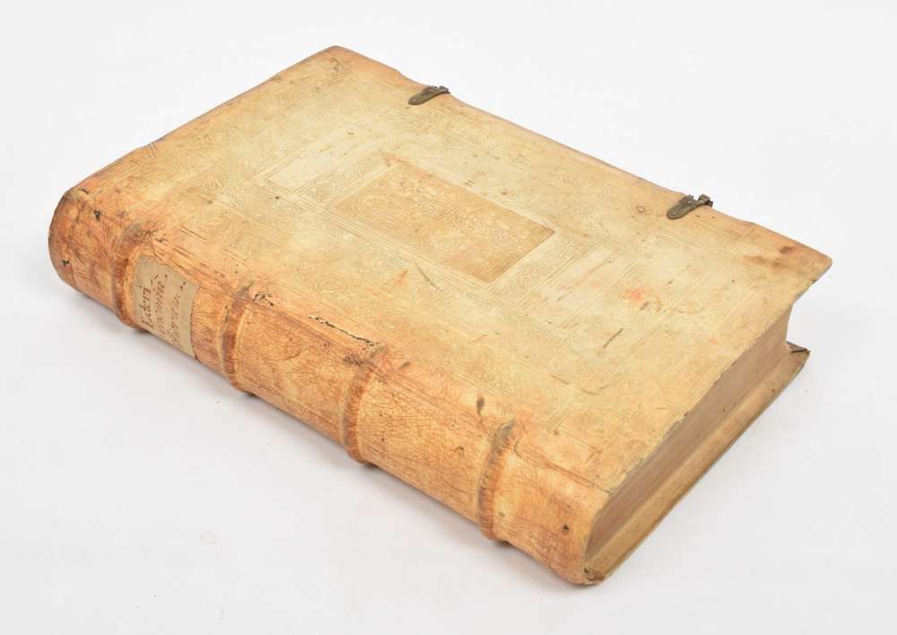 Besides a few defects a very good copy, with owner's annotation of the Franciscans at Vienna. The back board has along the top traces of a chain. Strip with extensive description inserted: "Wohl erhaltener Plattenbilder-Einband mit der seltenen Gethsemane-Rolle, von der Haebler nur noch ein anderes Exemplar nachweisen kann. Zu den Doppelbildern vgl. K. v. Rabenau, Dt. Bucheinbände der Renaissance um Jakob Krause, Nr. 33 (ähnliche Darstellungen von Wenzel Dörffler, Wittenberg 1567)." See extensively on Viennese imperial lawyer Georg Eder (1523-1587): https://tinyurl.com/y7ptau73.