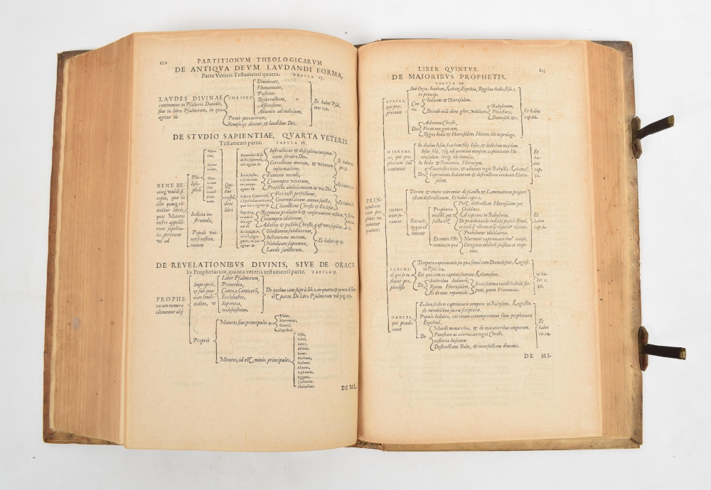 sive partitionum theologicarum libri quinque (...) authore D. Georgio Edero (...). His adiecimus partitiones Catechismi. Cologne, G. Calenius and estate of J. Quentell, 1571, 2 parts in one volume, (48),714,(1); (8),119 p. (partly using a cursive type), both volumes with woodcut title vignette and tailpiece, contemporary rich blindstamped pigskin across wooden boards, front with centered stamp with personifications of the 4 cardinal virtues, back board with centered stamp with personifications of the 4 theological virtues, both stamps surrounded by a double roll scroll border with biblical scenes and portrait medallions, ribbed back with title label, two finely finished copper clamps, folio.
