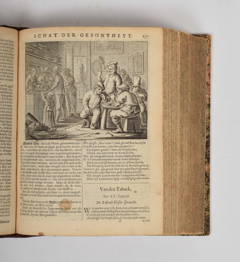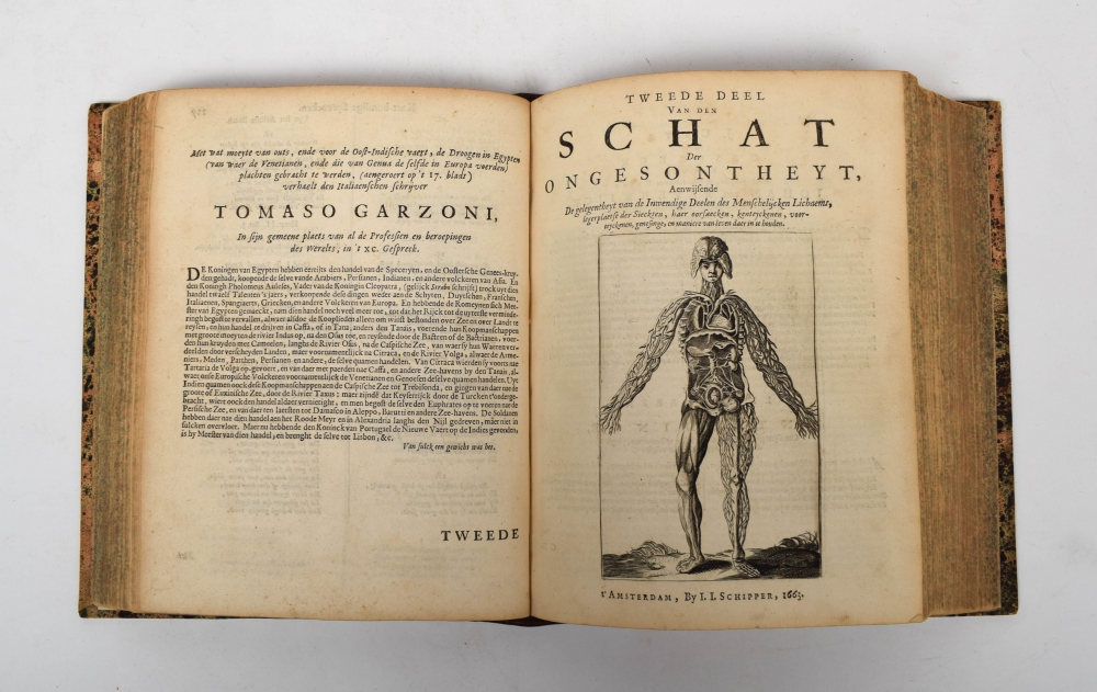 Wercken der genees-konste, bestaende in den schat der Gesontheyt, Schat der Ongesontheyt, Heel-Konste; mitsg. eenige tractaten daer onder begreepen, (…). Amst., Wed. J.J. Schipper, 1663. 5 parts in 1 volume. (18), 252; (8), 127, (1); 328; 48; (8), 278, (12) pp. With many engravings, lacks frontispiece. Bound in later half leather.