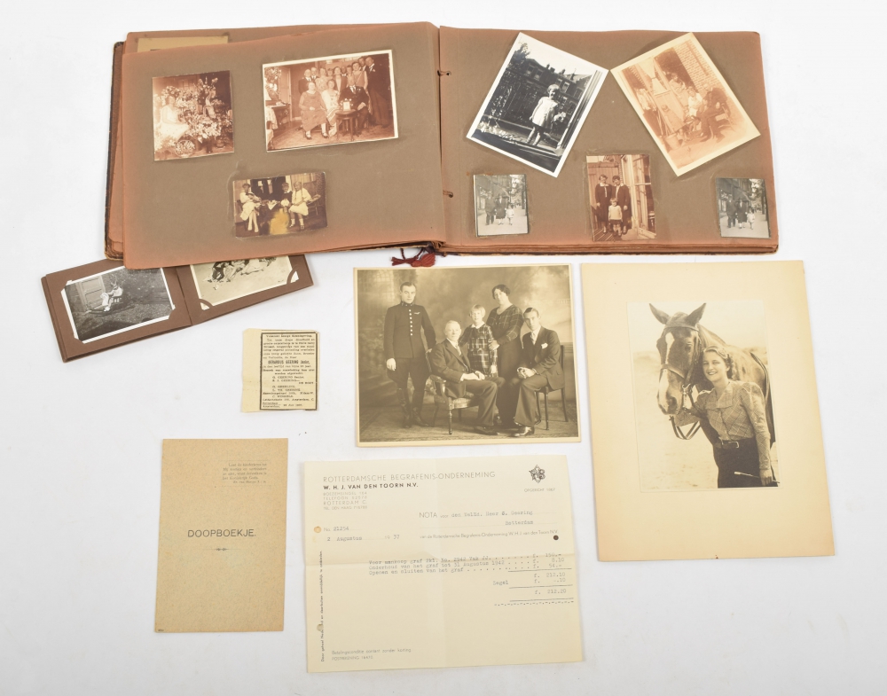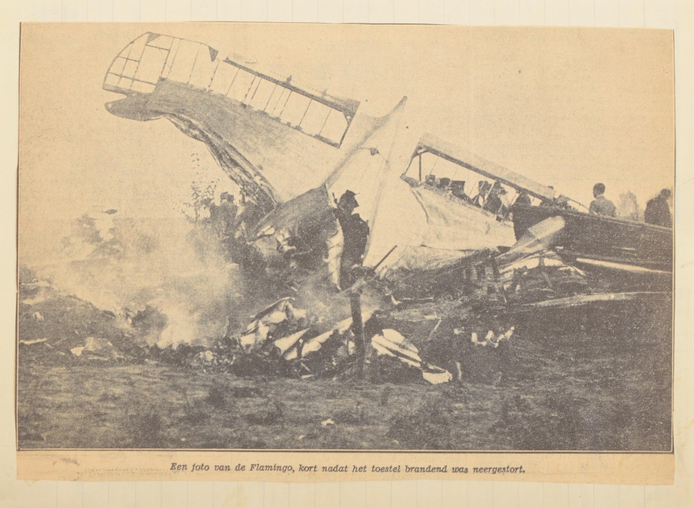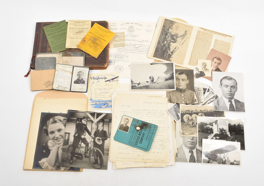 Consisting of one expired license of capability of Gerardus Geering, one duplicate and one valid at the time of the crash, his pilot's license and his driver's license cat. A, with burnhole + a photo book containing small (passport) photos + baptismal and funeral documents + 44 letters from Geering to his parents and brother and sister, several to his girlfriend and of a slightly later date from his parents to his girlfriend + ca. 30 photos of Geering himself - and a scrapbook with clippings on the Flamingo crash.
