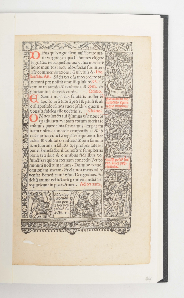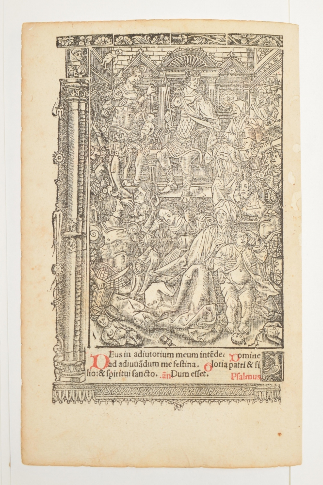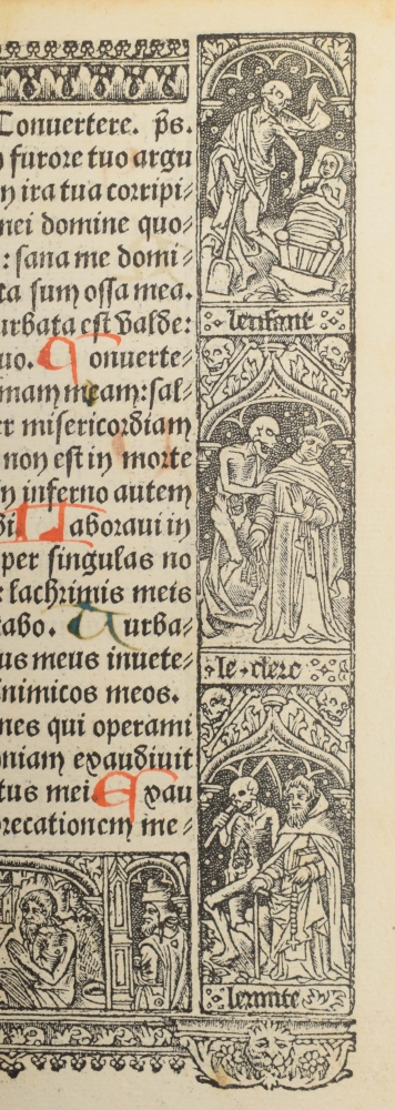 cum missa eiusdem (...). noviter impressum opa Thome Vvsali comorantis e regione collegij Italorum [title copied from colophon]. Paris, Thomas Kees/ Wesaliensis, (before 1511), 28 (of ?) leaves, incl. 15 leaves with double-sided metalcut borders surrounding the text (incl. hunting scenes and beautiful danse macabre series) and initials in red (and here and there in blue) and 13 leaves with 3/4-page metalcut and reverse with metalcut borders and initials in red, each page with blank margin pasted in modern cardboard album with title label on front board.