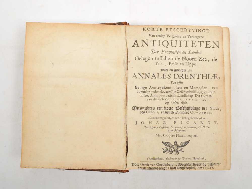 der provintien en landen gelegen tusschen de Noord-Zee, de Yssel, Emse en Lippe. Waar bygevoeght zyn Annales Drenthiæ, : dat zijn eenige aenteyckeninghen (...) gepasseert in het antiquiteet-rijcke landschap Drenth (...) mitsgaders een korte beschryvinge der stadt, des Kasteels, en der heerlykheit Covorden. T' samen vergadert, en aen't licht gebracht, door Johan Picardt. (...) Met koopere platen verçiert. [3 parts in one volume]. Amsterdam. Tymon Houthaak for Gerrit van Goedesbegh. 1660.