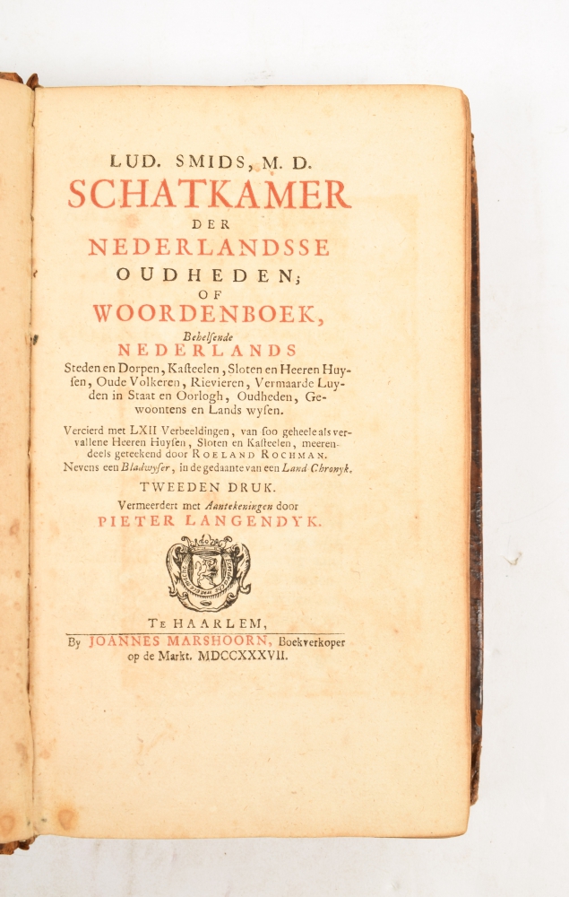 Large 8vo, leather, title on spine, frontispiece by J. Schynvoet, title in red and black with vignette, (16),417,(1) pp. + bladwijzer. Complete with 62 copperplates by Jacobus Schijnvoet after the famous castle drawings by Roeland Roghman. Spine with minor damage. Text and prints more heavily browned. Copy on larger paper. Ludolf Smids was a physician, poet and author of medical and historical works.