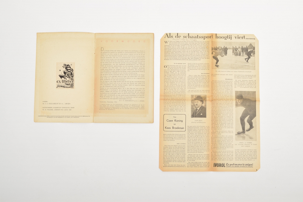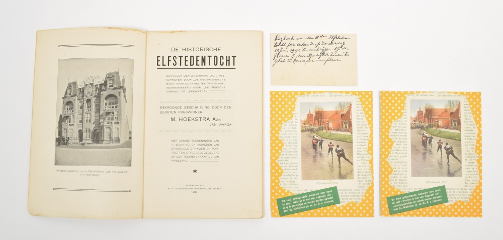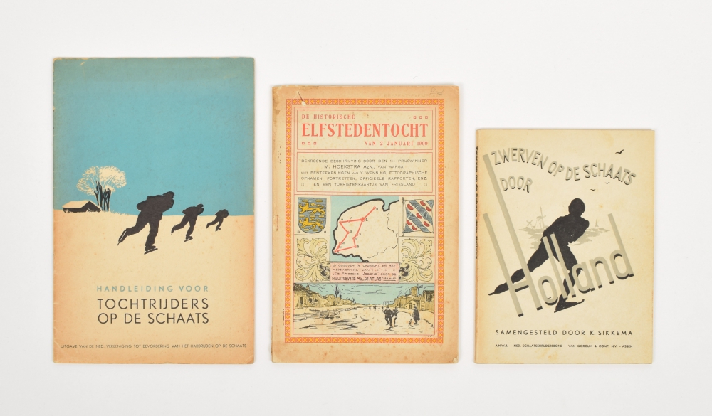 Bekroonde beschrijving door den 1en prijswinner M. Hoekstra Azn., van Warga. Uitgegeven in opdracht en met medewerking van "De Friesche Ijsbond" door de N.V. Uitgevers Mij. De Atlas, The Hague, 1909. 56 pp. Including map of Friesland*, stamp "present-exemplaar" on front + brochure on the Elfstedentocht 1954 + Handleiding voor tochtrijders op de Schaats. Ned. Vereeniging tot bevordering van het hardrijden op de schaats, 1942 - and 1 more.