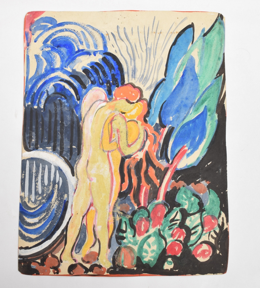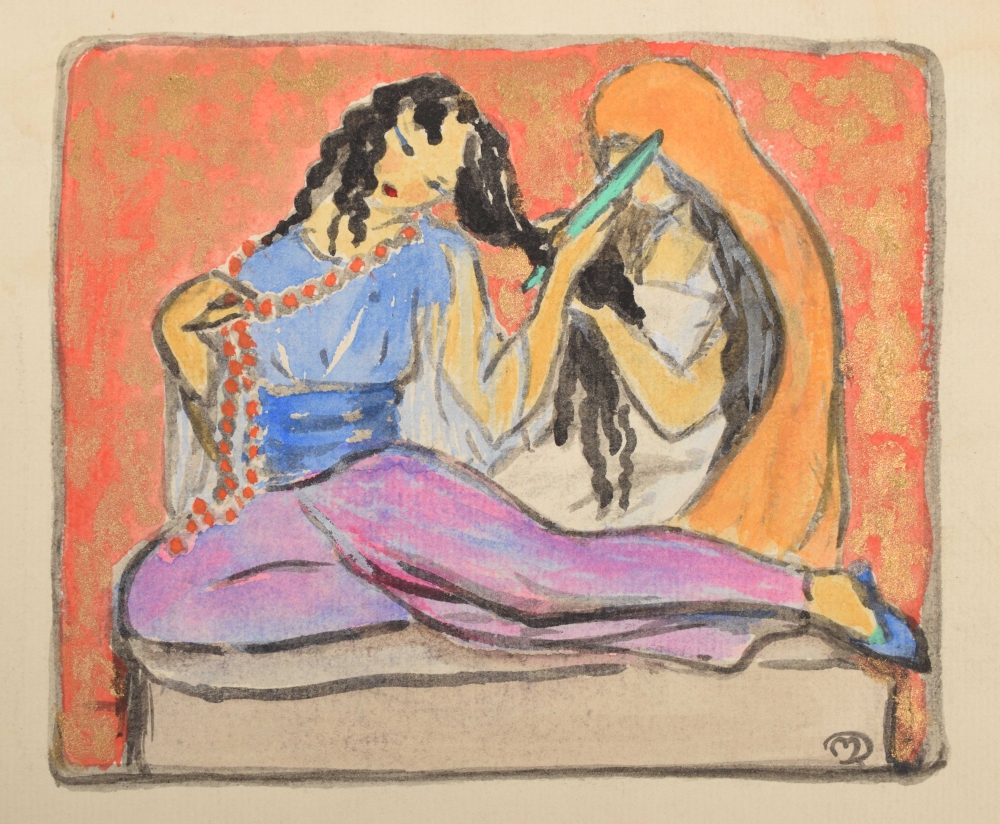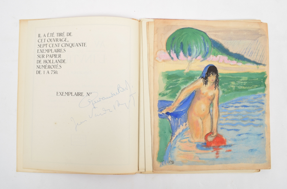 Copy printed on "Hollande", signed by brothers Roger and Jean Vander Borght, publishers. The colophon mentions 750 numbered copies having been printed, this copy is unnumbered. Our copy lacks the plate of the bouquet by Edgard Tytgat, but with five original drawings inserted: (1) (Skeletons in a carousel). Drawing on tracing paper in pen and black ink, finished as gouache, by Jean Vander Borght, signed, 14.5 x 11 cm.; (2) (Embrace of man and woman in landscape). Gouache, attributed to Jean Vander Borght, 24 x 18.5 cm.; (3-4) (Harem women). Two drawings in brush and black ink, finished as gouaches and heightened with gold, monogrammed "MD" (Maurice Denis?) or "MV" (Maurice Verne?), 16.5 x 18 and 12.5 x 15 cm.; (5) (Bathing woman). Gouache with the same monogram as the previous two, 25.5 x 20 cm.