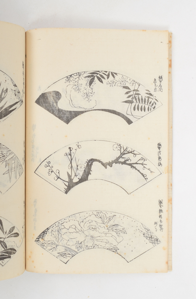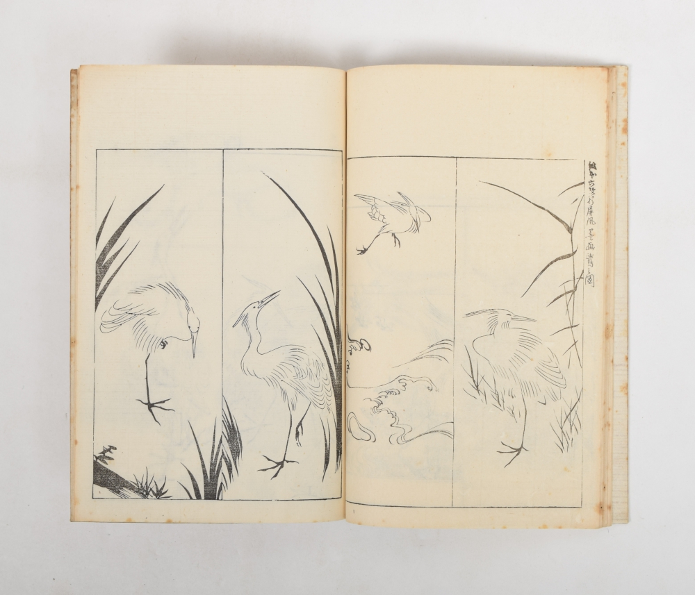 Two sets of two volumes appeared, here only the second set is present. The original edition of these drawings by Sakai Hoitsu (1761-1828) after paintings by Ogata Korin (1658-1716) was published from 1815 to 1826. The present edition is a facsimile of that edition. Another two reissues appeared in 1890 and 1894 (total 2 volumes).