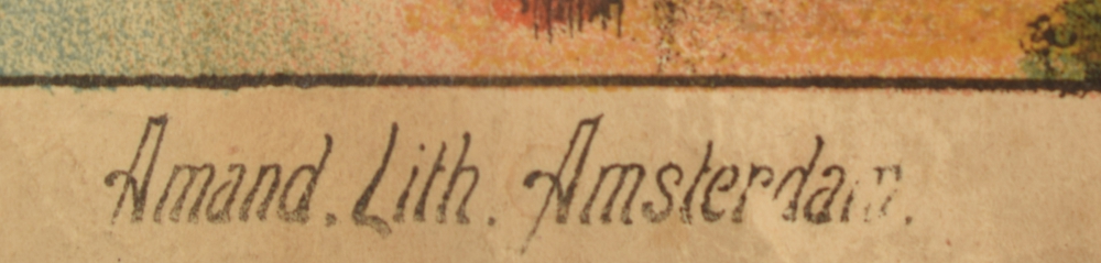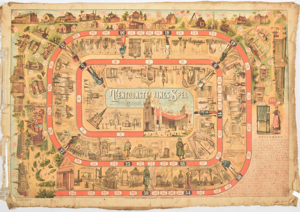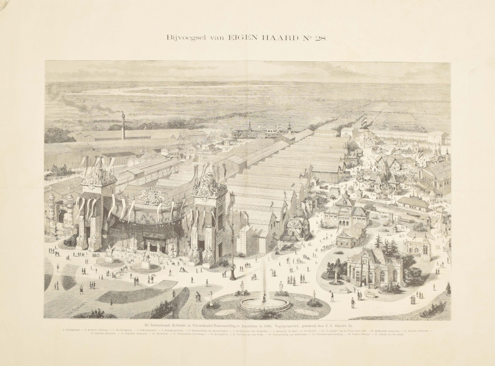 Vogelperspectief, geteekend door J. C. Greive Jr. 47 x 64 cm. Supplement Eigen Haard no. 28, 1883 + (Koloniale) Tentoonstellingsspel. Published by Gebr. Koster, Amsterdam, 1883. Colour lithography, Amand Amsterdam. 46 x 66 cm. Stained, pasted on old cloth, partly loose, leaving margins weathered. The plate itself good (total 2).
