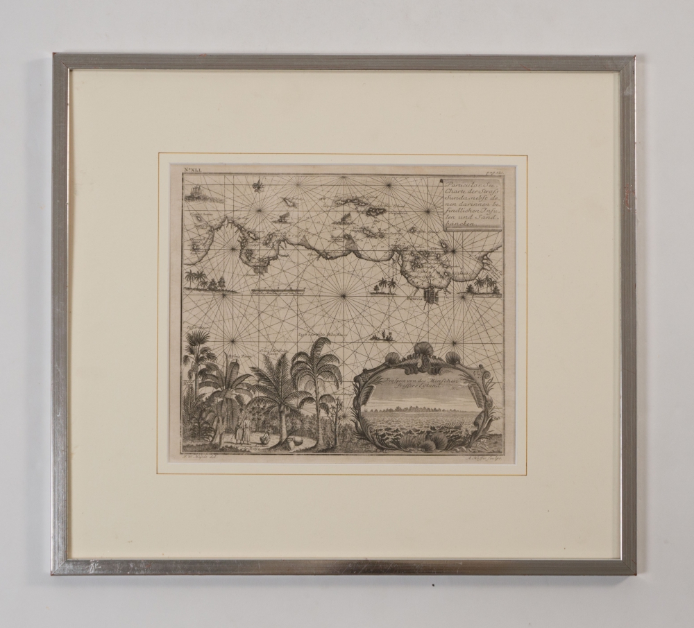 And: Particular-See-Charte der Strass Sunda nebst denen darinnen befindlichen Insulen und Sandbäncken. The coast before Batavia with palm beach. Copperplate by A. Hoffer after J.W. Heijdt. [Ca. 1700]. Framed in mount. 22 x 26 cm. Frame 42 x 47 cm. Good copies (total 3).