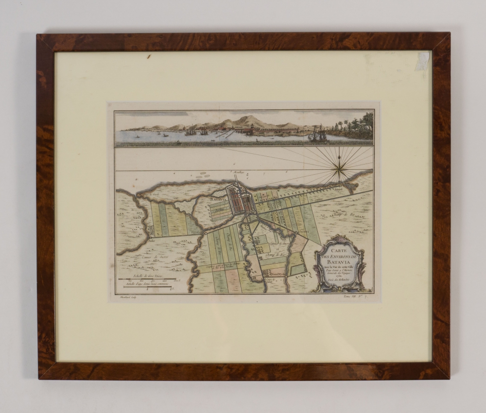 Carte des environs de Batavia. 1750. Dheulland after Nicolas Bellin. Handcoloured copperplate in mount under glass, 20 x 28 cm. Frame 38 x 45 cm. + De Reede van Batavia. Maaskamp. Amsterdam. 1805. H. Kobell after M. de Sallieth. Copperplate in mount under glass. 23 x 29 cm. Frame 40 x 45 cm.