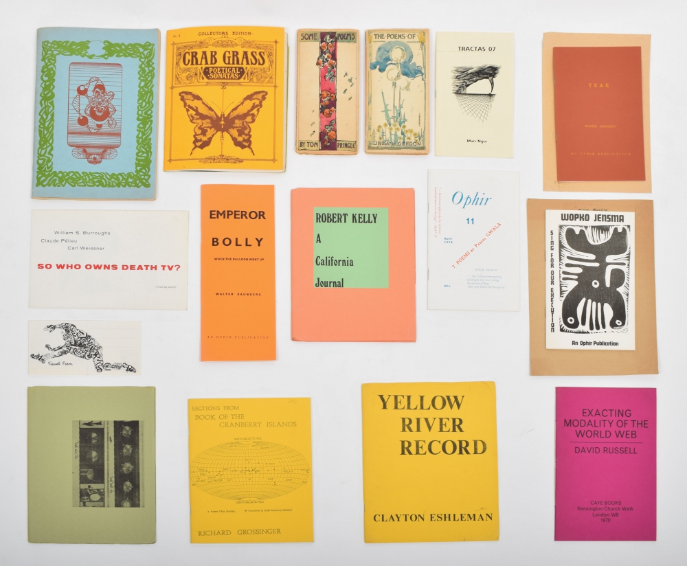 (2) Bavuska or the rub. The rubber or Greta's bust (...). Random selections from Allen Fisher's simultaneous novels. Ibid., idem, 1969, (2),19,(3) p., original wrapper, 4to; (3) Sections from Book of the Cranberry Islands. Richard Grossinger. Ibid., idem, n.d., 49 p., original wrapper; (4) A California Journal. Robert Kelly. Ibid., idem, 1969, 36,(4) p., original wrapper. And with 8 more by other (alternative) publishers, incl. several titles illustrated with cartoons and incl. 4 "Ophir publications" and 2 finely published poetry collections published by T.N. Foulis (London & Edinburgh) (total 15).