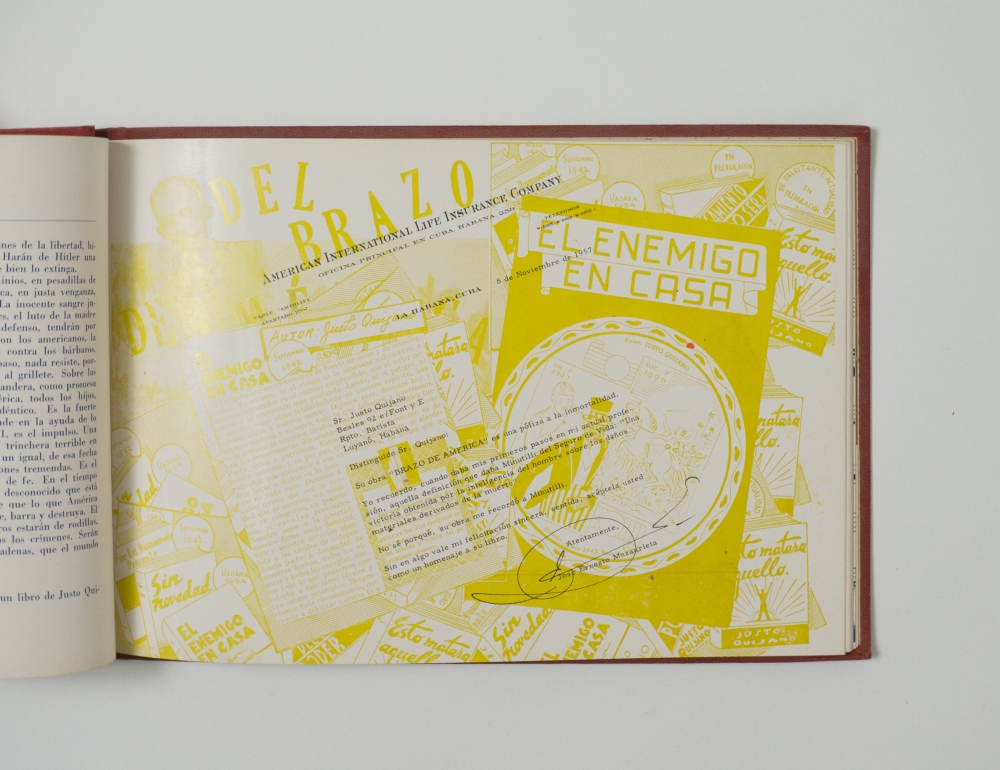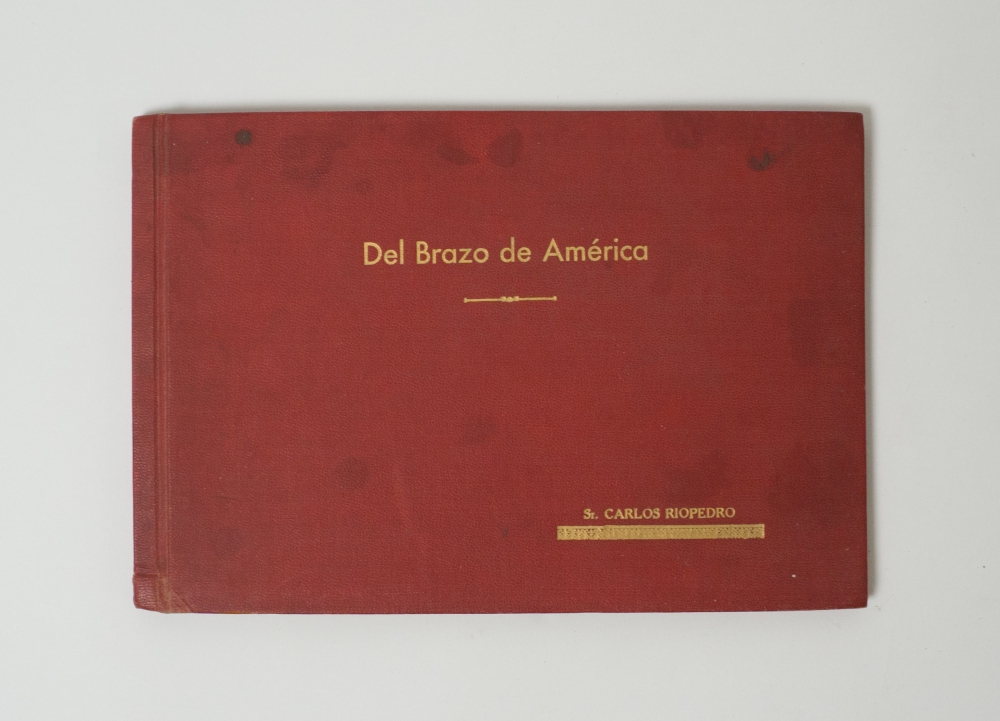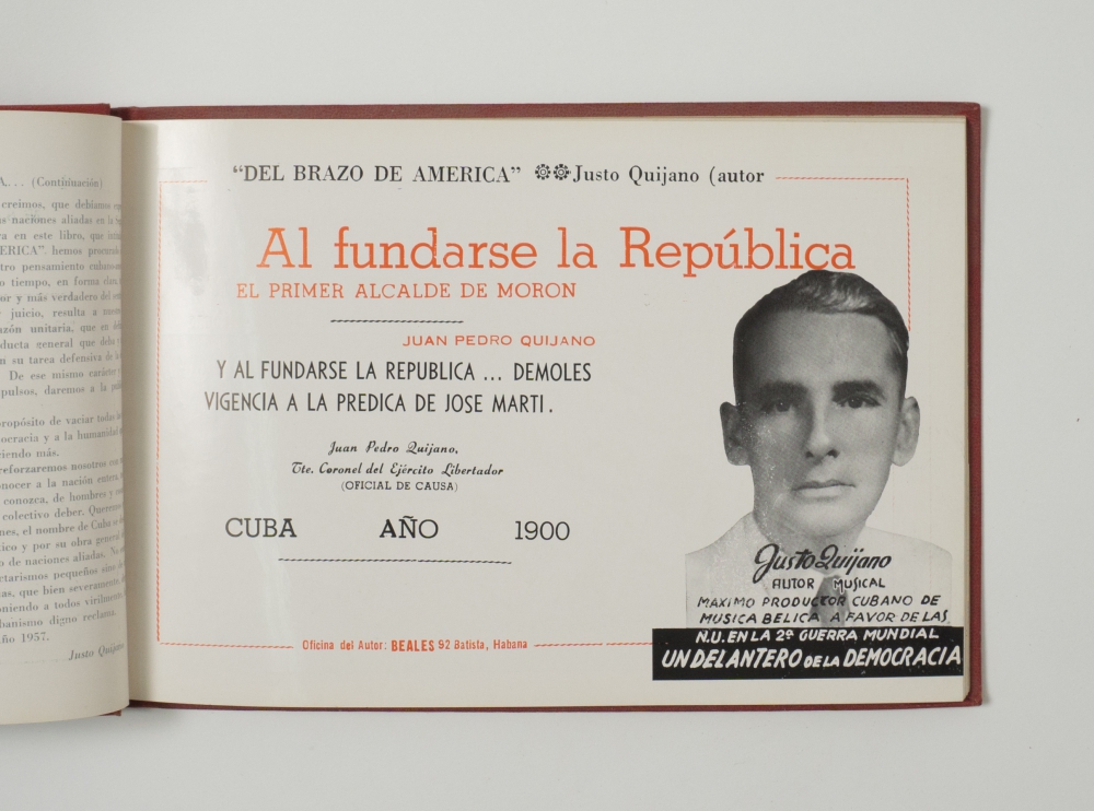[On the arm of America]. Justo Quiano (autor musical). Havana, 1958, 31 leaves on thick paper printed on both sides with a smooth front and non-smooth reverse, printed in many colours and with various (photographic) illustrations and portraits of singers and musicians, original gilt-lettered cloth in name of Sr. Carlos Riopedro on front board, oblong 4to (minimal defects).
