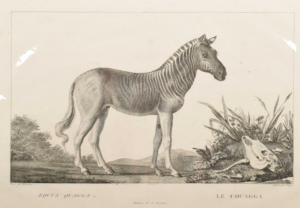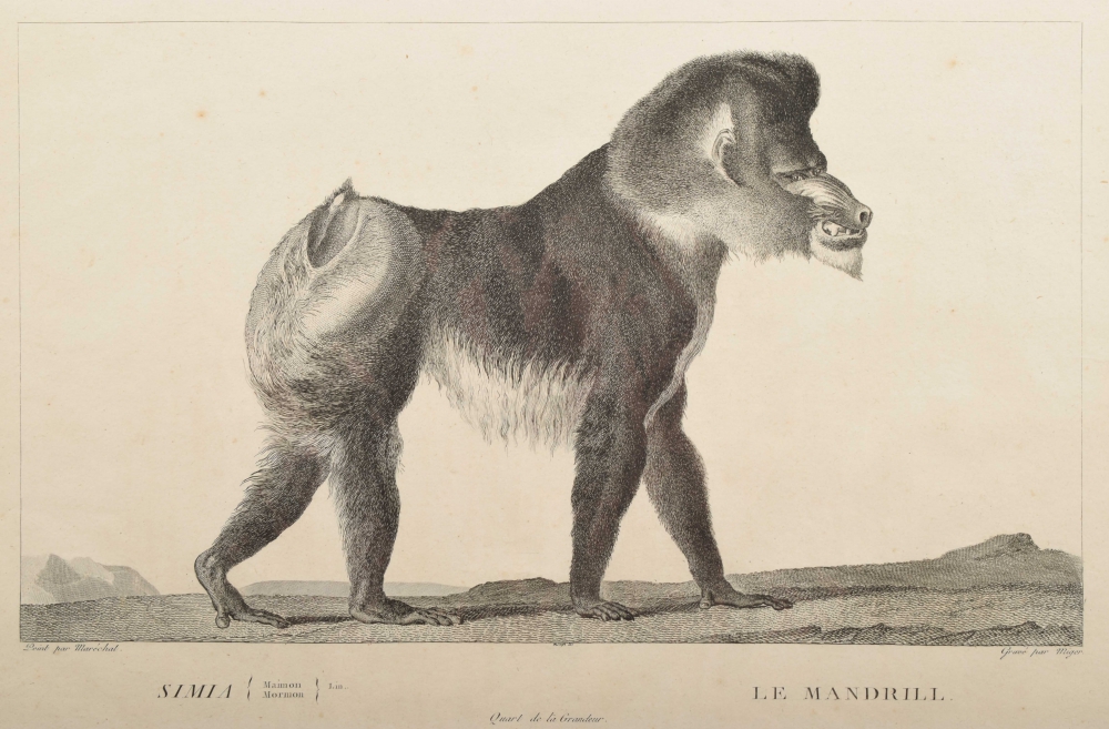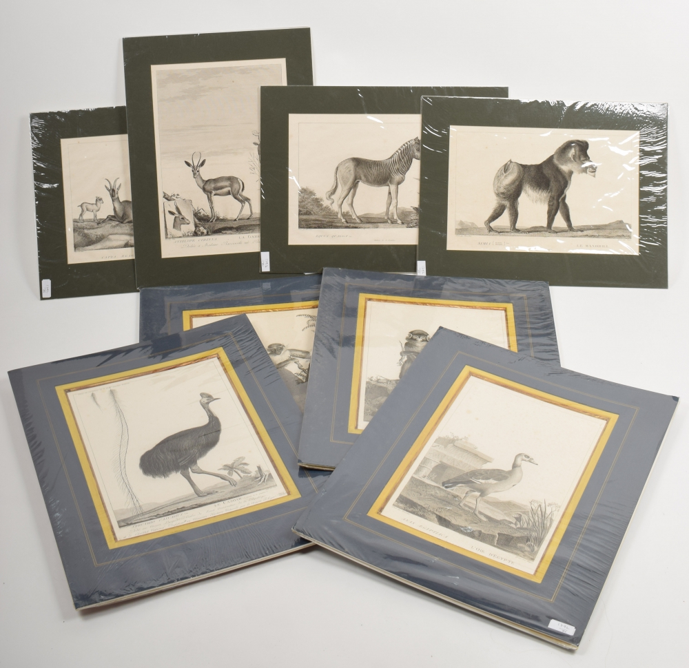 1. Struthio Casuarius. 2. Anas Aegyptiana. 3. Simia Petaurista. 4. Simia Sabaea. 5. Capra Aegagrus. 6. Equus Quagga. 7. Simia Maimon. 8. Antilope Corinna. Very finely finished copper engravings by Simon Charles Miger after Maréchal for La Menagerie du Museum National d'Histoire Naturelle by Bernard-Germain-Étienne Delaville, Comte de Lacépède. Paris. 1800-01. Nos. 1-4 in mount with synthetic lining and plasticised protective sheet. Print image ca. 39 x 26 cm. Mount 60 x 47 cm. Nos. 5-8 in mount and plasticised protective sheet. Print image 25 x 37 cm. Mount 39 x 52 cm.