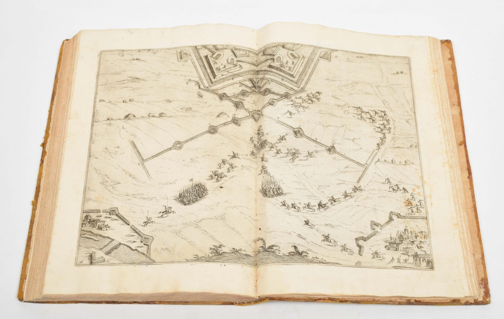 (14),83,83,128 pp., portrait of the author, 48 copperplates of which 11 double-page. Shabby binding, plate 40 upside down; several plates misbound. Frontispiece with minor imperfections. Extra: reduced-size copy of frontispiece and annotations in pencil on endpaper, here and there light browning and (water)staining. Printed at Venetia by Evangelista Deuchino. 1624, on final text leaf. [Frontispiece of 2nd edition from 1630 added?].
