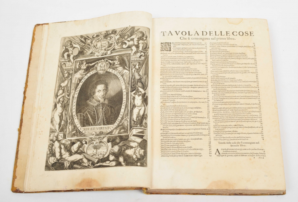 La Fortificatione Guardia difesa et espugnatione delle Fortezze esperimentata in diverse guerre del Cavaliero Francesco Tensini da Crema (...). Venetia. Antonio Bariletti. 1630. Folio, leather, illustrated frontispiece with title by Philippo Sadeler.