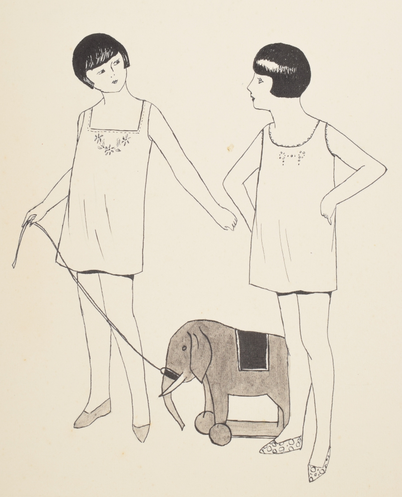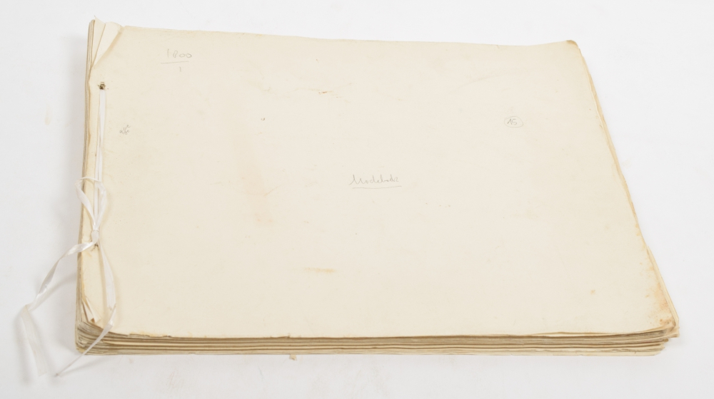 Designs with text and models for women and children; various leaves added separately. Japanese binding with tie. Ca. 80 pp. Curious.