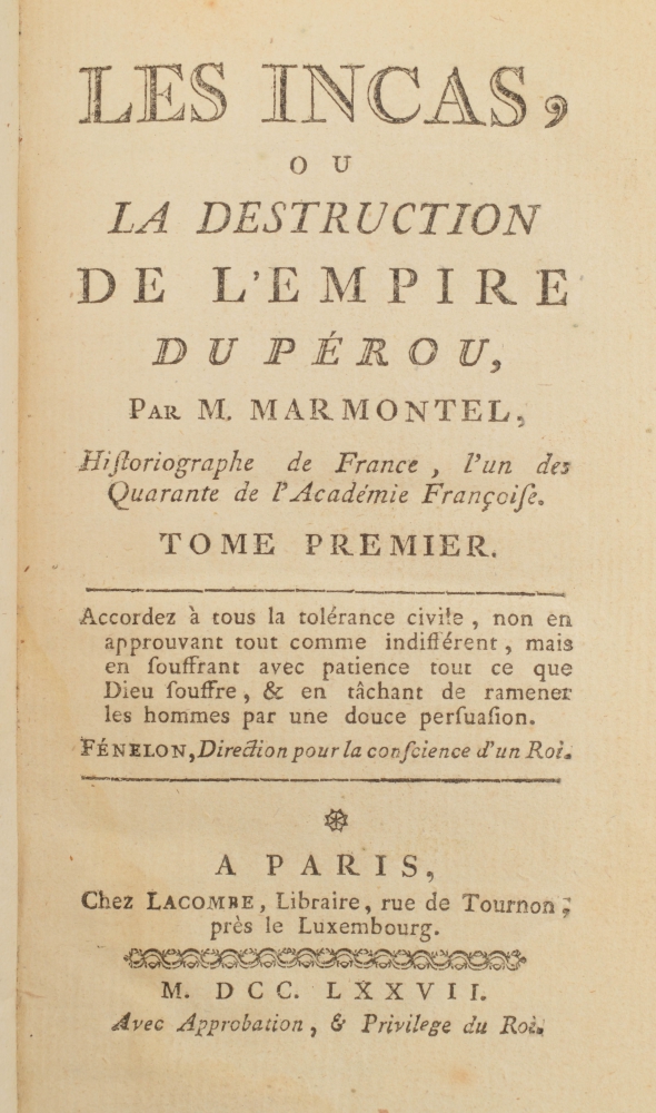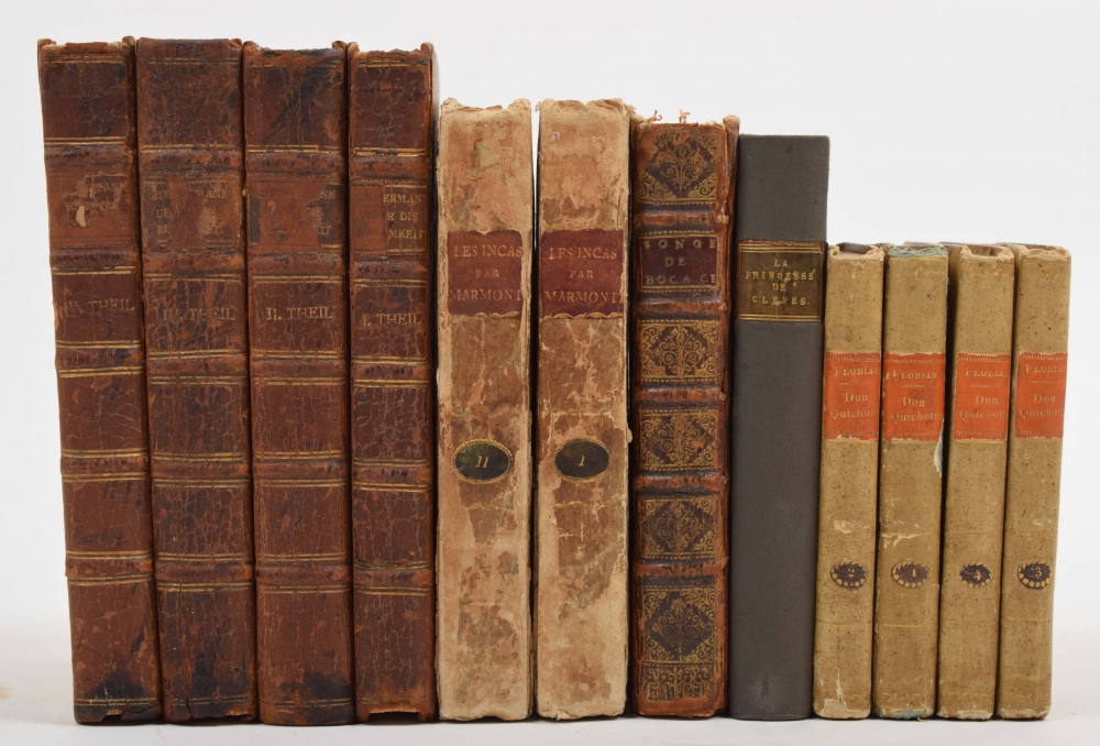 Don Quichotte de la Manche. traduit de l'Espagnol par Florian. [4 volumes]. Paris. Ant. Aug. Renouard. 1812. 12mo, illustrated + Ueber die Einsamkeit. Johann Georg Zimmermann. [4 volumes]. Carlsruhe. Christian Gottlieb Schmieder. 1785 + Les Incas, ou la destruction de l'empire du Perou. [2 volumes]. Paris. Lacombe. 1777 [copy without the engravings] + 2 more (total 12).