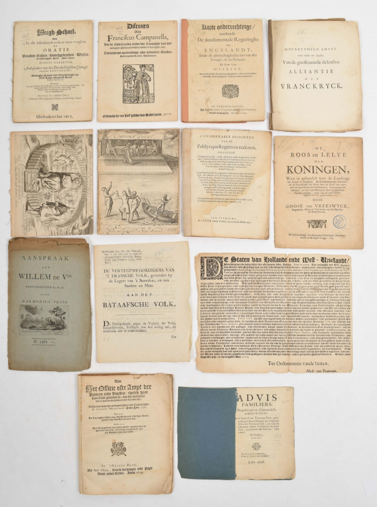 Discours van Franciscus Campanella. Hoe de Nederlanden onder des Coninghs van Hispaengien ghehoorsaemheyt weder te brenghen zijn. 1618 + Aan het Offitie ofte Ampt der Princen ende Vorsten t'welck haer van Godt geboden is (...) Beschreven door den eerwaerdighen ende Godtsalighen D. Philippus Melanchton in den jare 1537. The Hague. Aert Meuris. 1619 + Weeg-Schael om in alle billickheydt recht te over-weghen de oratie vanden Eedlen Hoochgeleerden Wijsen Voorsienighen Heere Mijn Heere Dudley Carleton (...) [Jacobus Taurinus]. 1617. Knuttel 2366; bound together with: Copie. De staten Generael der Vereenichde Nederlanden. 1617 [with a confirmation of the preceding text]. Knuttel 2369 +