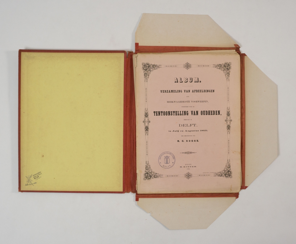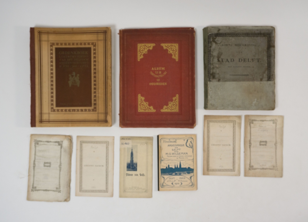 Shabby and bumpy copy, here and there stained, top hinge tender on inside. Relatively rare work, illustrated with fine, large aquatints. The tight map (made specifically for this edition) very clearly indicates the various monuments in the city, with good legends; (2-3) Bericht aangaande de inwyding van het kerkgebouw des genootschaps Christo Sacrum binnen Delft. Delft, weduwe Jan de Groot en Zoon 1802, 20 p., original cordbound wrapper. Two copies, both approved by M.J. Macquelin in pen on reverse title; (4-5) Berigt aangaande den plegtigen eerdienst bij gelegenheid van de vijf-en-twintigste verjaring der oprigting van het Genootschap Christo Sacrum. No place, publisher or year (1822), 14,(2) p. incl. original cordbound wrapper. Two copies. And with another 4 various works (total 9).