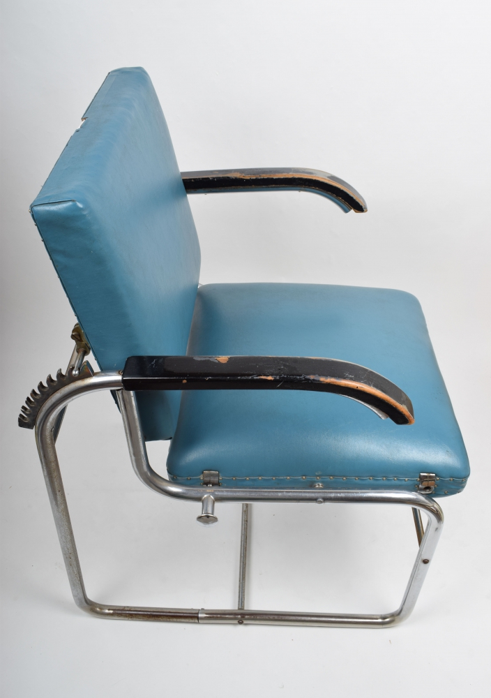 Tubular frame chair by Paul Schuitema, 1932. Produced by Fana Metaal, Rotterdam. Rare variant in dark turquoise. With gear system on back in order to recline the seat.