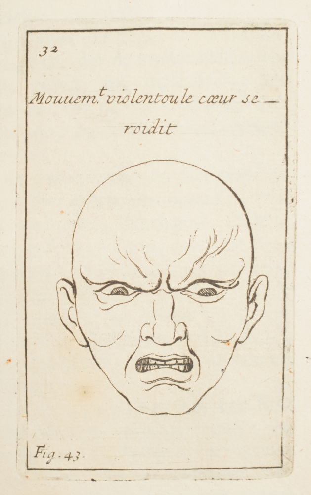 (12),55,(1) pp., complete with 43 copper engravings of facial expressions, binding with minor imperfections, spine repaired with black tape, title page top with piece of 5 mm. cut out (to remove name), the caricatural engravings in bright printing.