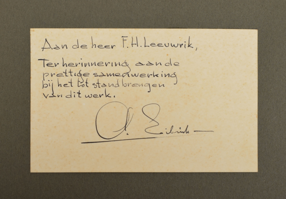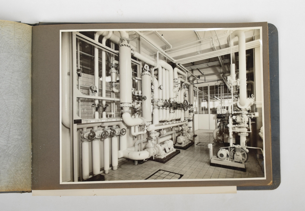 Fotograaf Woudt, Zaandam, c. 1936. Album with 15 photos of the then-recently completed building on the west side of the compound for Verkade by architects J.A. Snellebrand and A. Eibink. With pasted note by Eibink to F.H. Leeuwrik expressing thanks for his help and cooperation. Photos each 23.5 x 17.5 cm.