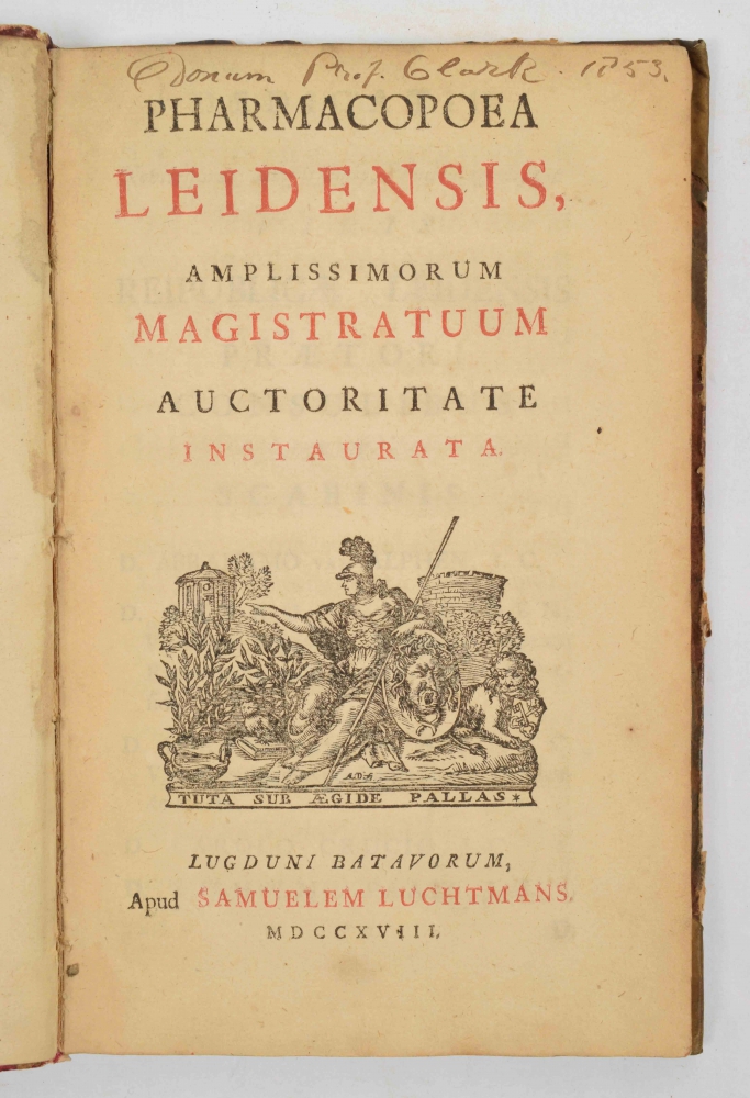 Amplissimorum Magistratuum Auctoritate Instaurata. Anonymous. Leiden, Samuel Luchtmans, 1718. 8vo, 172 pp. Red leather with marbed paper boards. Pharmacopoea for Leiden pharmacists, with printer's mark on title page: ‘Tuta sub Aegide Pallas.’