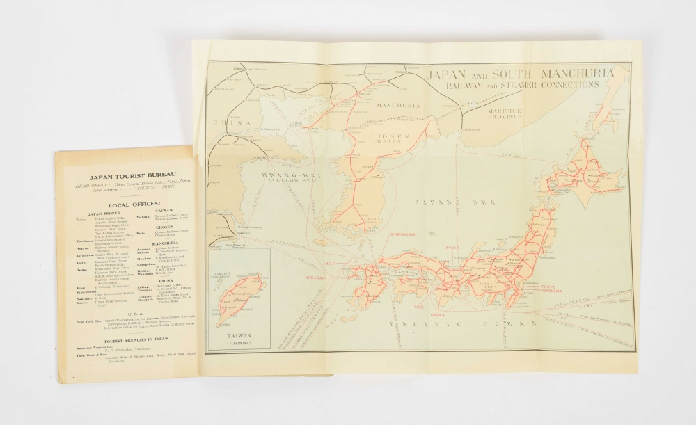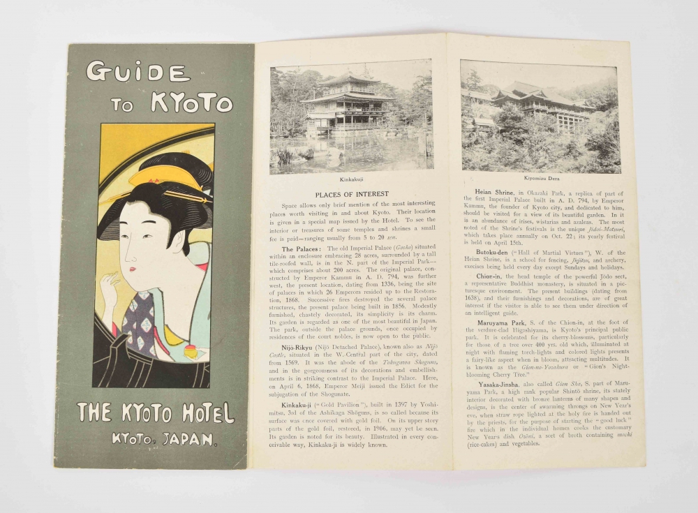 Guide to Kyoto. The Kyoto Hotel + Handbook of Yokohama + Nara & its Vicinity + Map of Kyoto and Vicinity with Shopping directory + Specimen Tours in Japan issued by Japan Tourist Bureau, Tokyo, 1929. With map incl. Formosa (Taiwan) - and 6 more. All pre-1940.