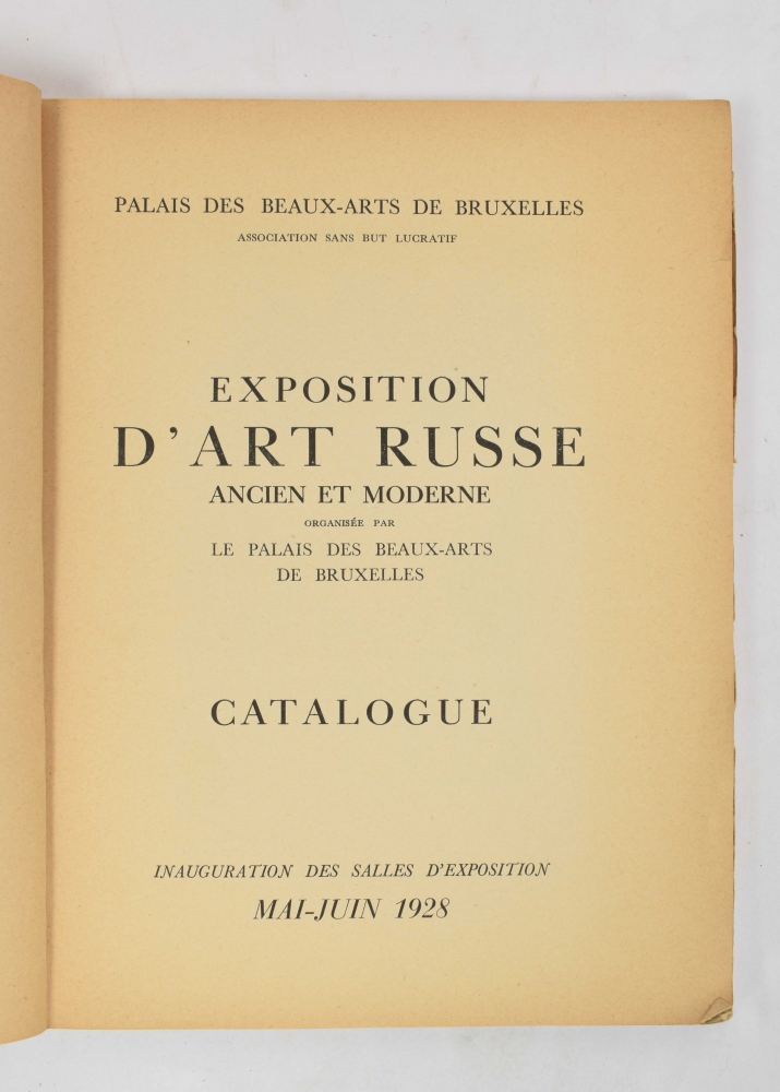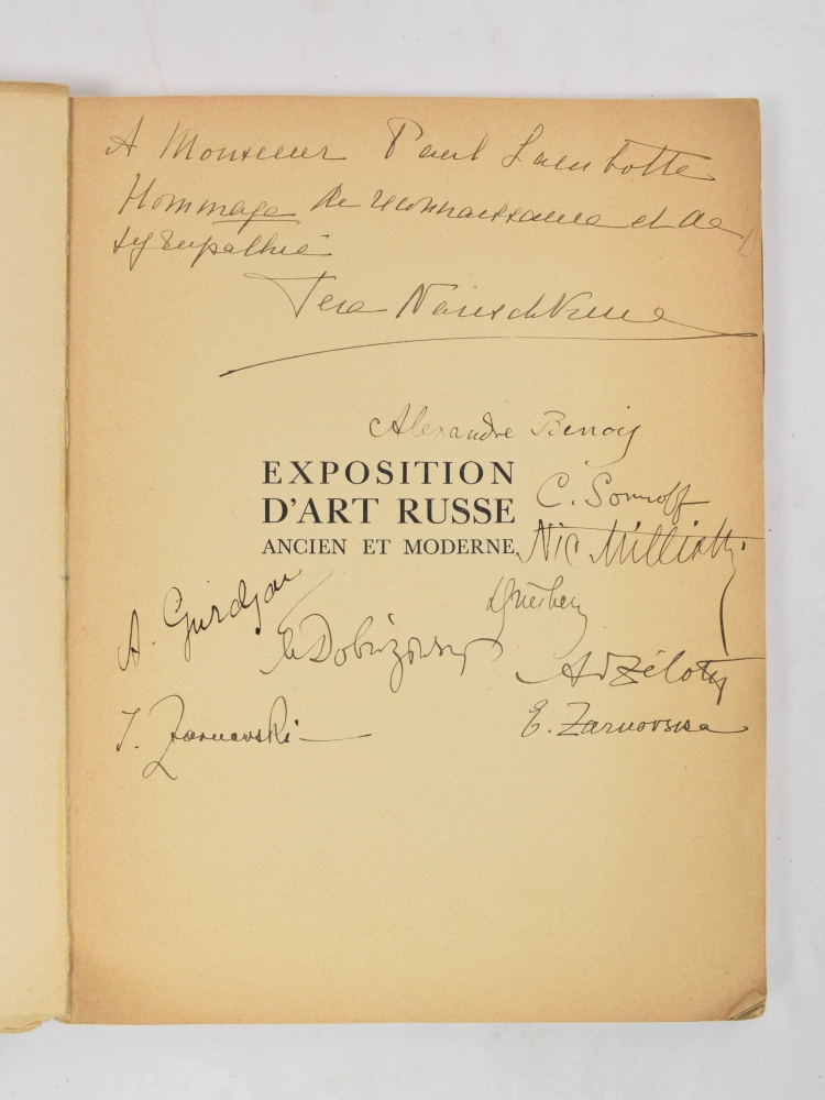 organisée par le Palais des Beaux-Arts de Bruxelles. Catalogue. Mai-Juin 1928. 88 pp. text + plates. Original wrapper, 4to. With signatures of participating artists on title page, incl. Véra Narischkine, Alexandre Benois, Mstislav Dobuzhinsky, Akop Gurdjan, Konstantin Somov and Nicolas Milliotti.