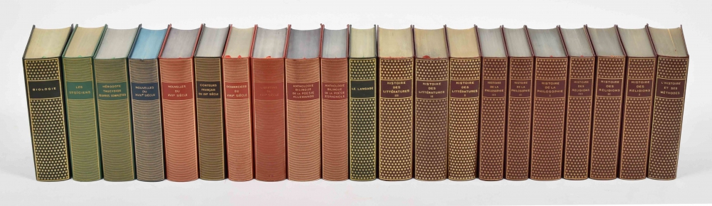 Encyclopedie de la Pléiade: Histoire des littératures I-III. 1955-1958 + Histoire de la philosophie I-III. 1969-1974 + Histoire des religions I-III. 1970-1976 + L'histoire et ses méthodes + Biologie + Le langage. With: Les Stoïciens + Hérodote & Thucydide. Oeuvres complètes. And with: Nouvelles du XVIIe siècle + Nouvelles du XVIIIe siècle + Conteurs français du XVIe siècle + Romanciers du XVIIe siècle + Libertins du XVIIe siècle. And: Anthologie bilingue de la poésie espagnole + Anthologie bilingue de la poésie allemande.