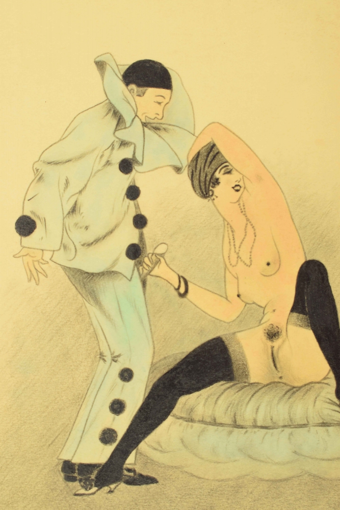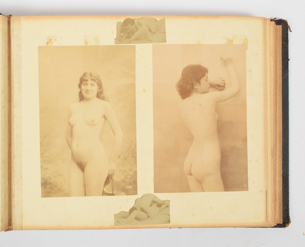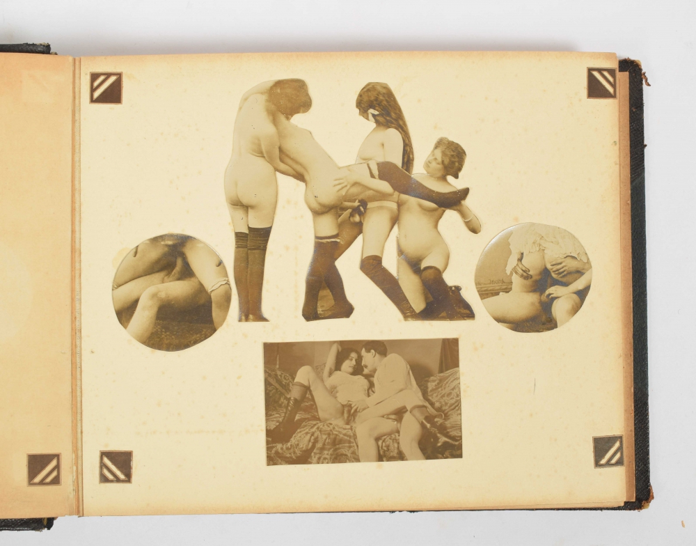 Oblong album with ± 190 pasted photos, partly cut in shapes, of copulating, experimenting and pornographically depicted couples, trios and solos. Finely collated in oblong album.