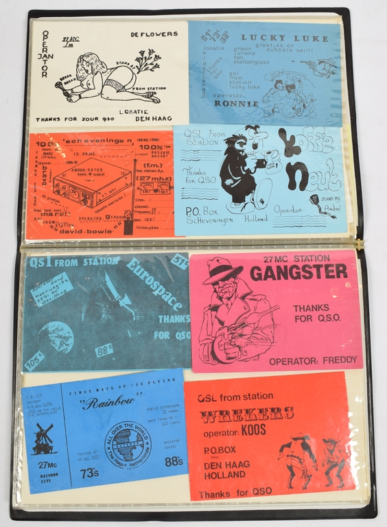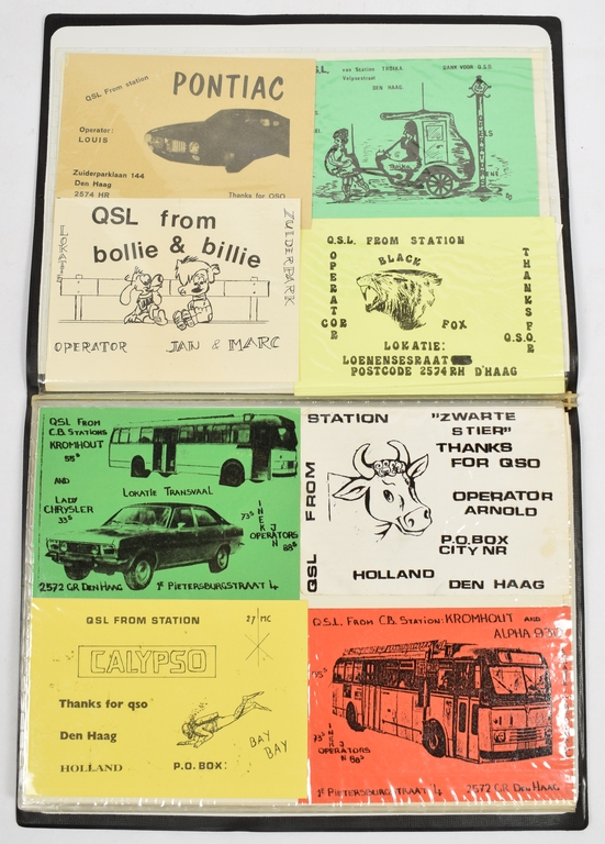 Lovely collection, illustrative for a special piece of cultural history, contains cards of stations such as "Station Punthoofd" (Rotterdam, operators Paula and Jaap), "Lady Bingo" (Beusichem), "Lady Astrid" (Loosduinen), "Station Dr. Dood" (The Hague, operator Peter), "Station Orca" (The Hague, operator John), "Mobiel Station Flying Starlet Lok (Leiden, operator Wouter), "Station Dobo" (Leerdam, operator Frans), "Klippergeit + Lady" (Elsloo), "Station De Gelaarde Kat" (Delft, operator Peter), "Station Pontiac" (The Hague, operator Louis). (total nearly 200 in 3 files)