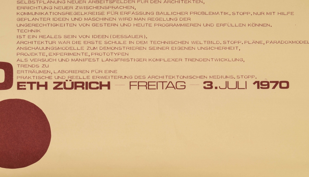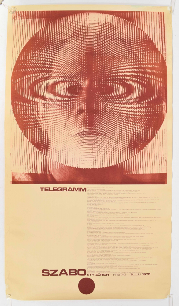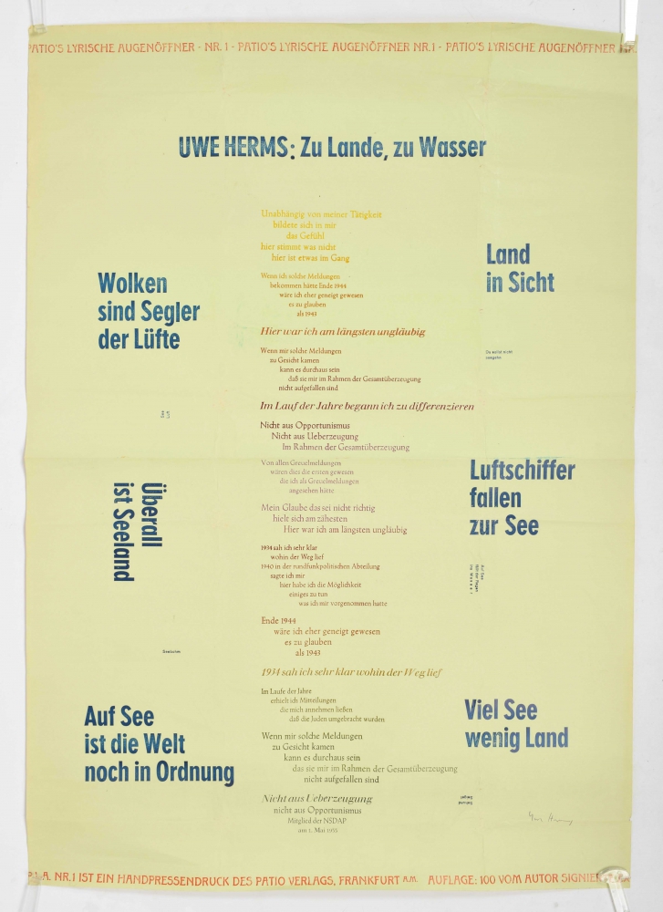 Patio's Lyrische Augenöffner Nr. 1. Uwe Herms: Zu Lande, zu Wasser. Frankfurt a.M., Patio's Verlag. Auflage: 100 vom Autor signierte ex. 82 x 59. Signature Herms bottom right. Trifle creased and slightly blue-stained top centre, else good + Telegramm von Stadt Düsseldorf nach Zürich. Szabo. ETH Zürich-Freitag 3. Juli 1970. 107 x 61 cm. Trifle creased in left margin, else good.
