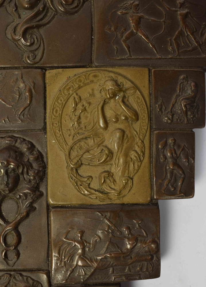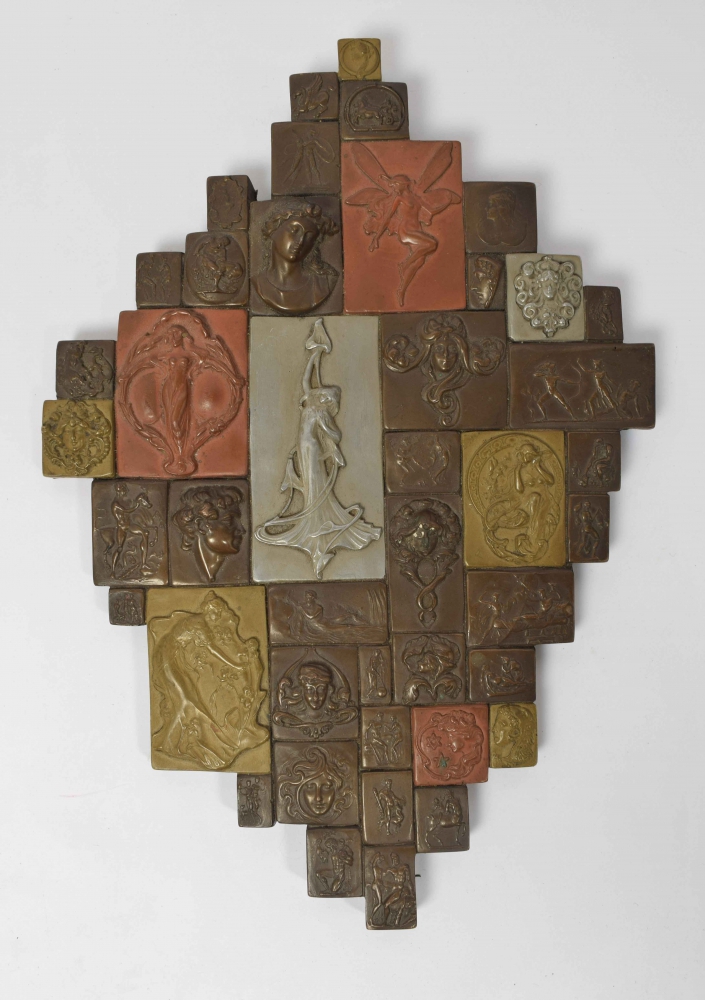 Refined reliefs with subjects Roman and Greek figures and Art Nouveau designs. Of this work we traced a version with a different distribution of the various patina colours (titled "Peace"), and a larger "collage" produced in the same manner. The artist was murdered in 1981 together with his girlfriend and business partner. Extensively on him and his work: https://tinyurl.com/ydyw2elg.