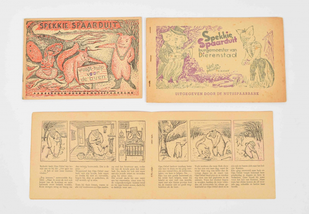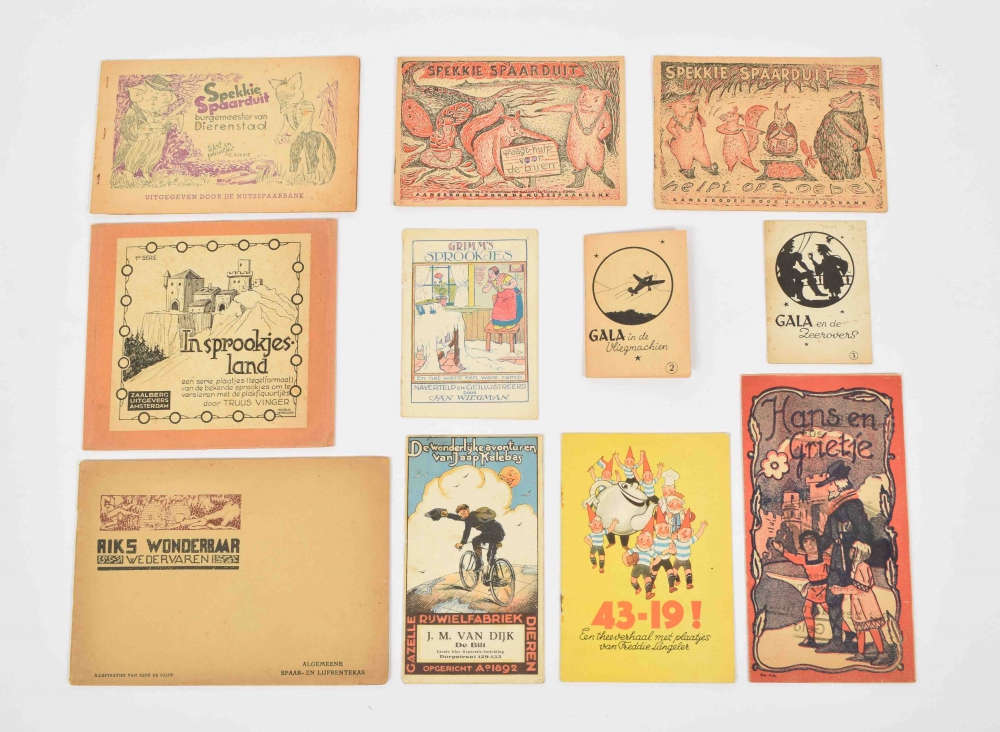 10 advertising booklets incl.: 43-19! Een theeverhaal met plaatjes van Freddie Langeler. Uitgave van het Theebureau, Amsterdam + De wonderlijke avonturen van Jaap Kalebas. J.M. van Dijk, De Bilt, with price list for Gazelle bicycles 1927 + 2 booklets for Gala Thee, published by Niemeijer, Groningen + 2x Spekkie Spaarduit, c. 1950.