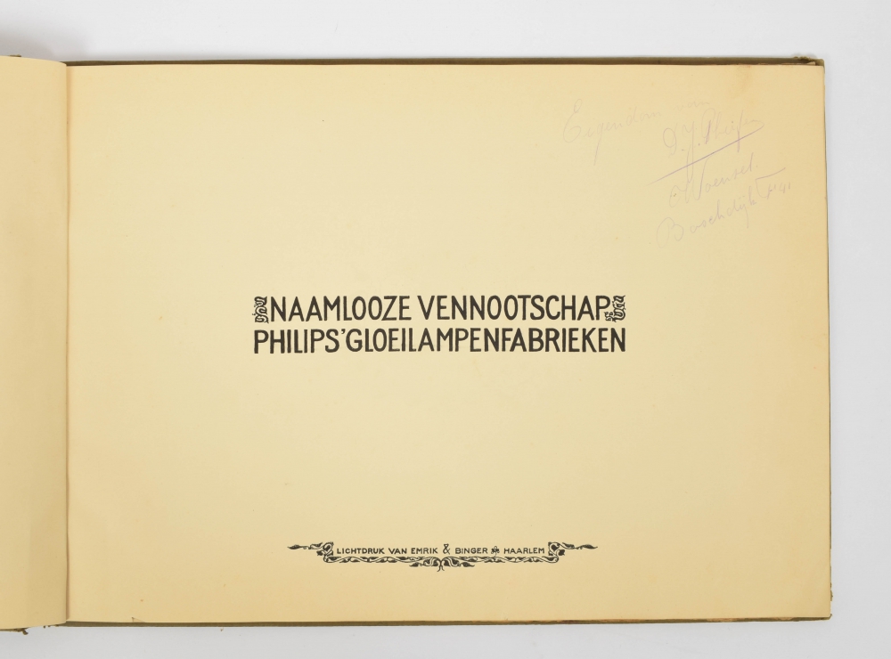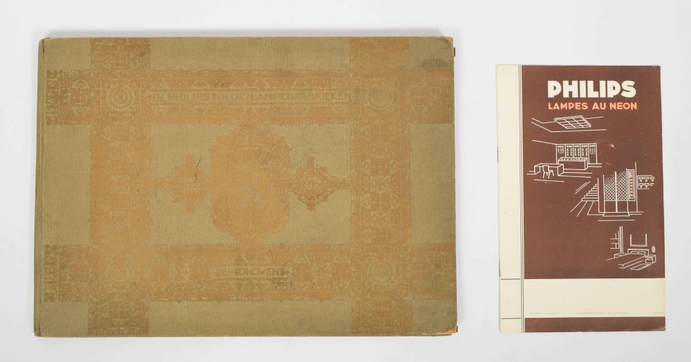 Naamloze Vennootschap Philips' Gloeilampenfabrieken 1891-1916. J. Feith, Eindhoven, 1916. Minimal damage to spine and edges, good copy in Art-Nouveau binding by Theo Nieuwenhuis + brochure Philips Lampes au Neon, Brussels, c. 1940. 8 pp.