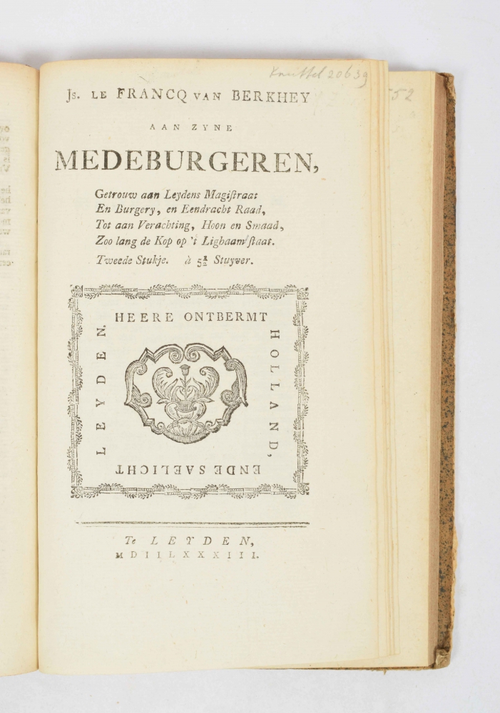 Convolute with pamphlets 'Berkhey verz. van stukken', Johannes le Francq van Berkhey. Frans de Does, T. Koet, Leiden, 1783. 36 pp., 4to. With another 3 pamphlets by and against Van Berkhey.